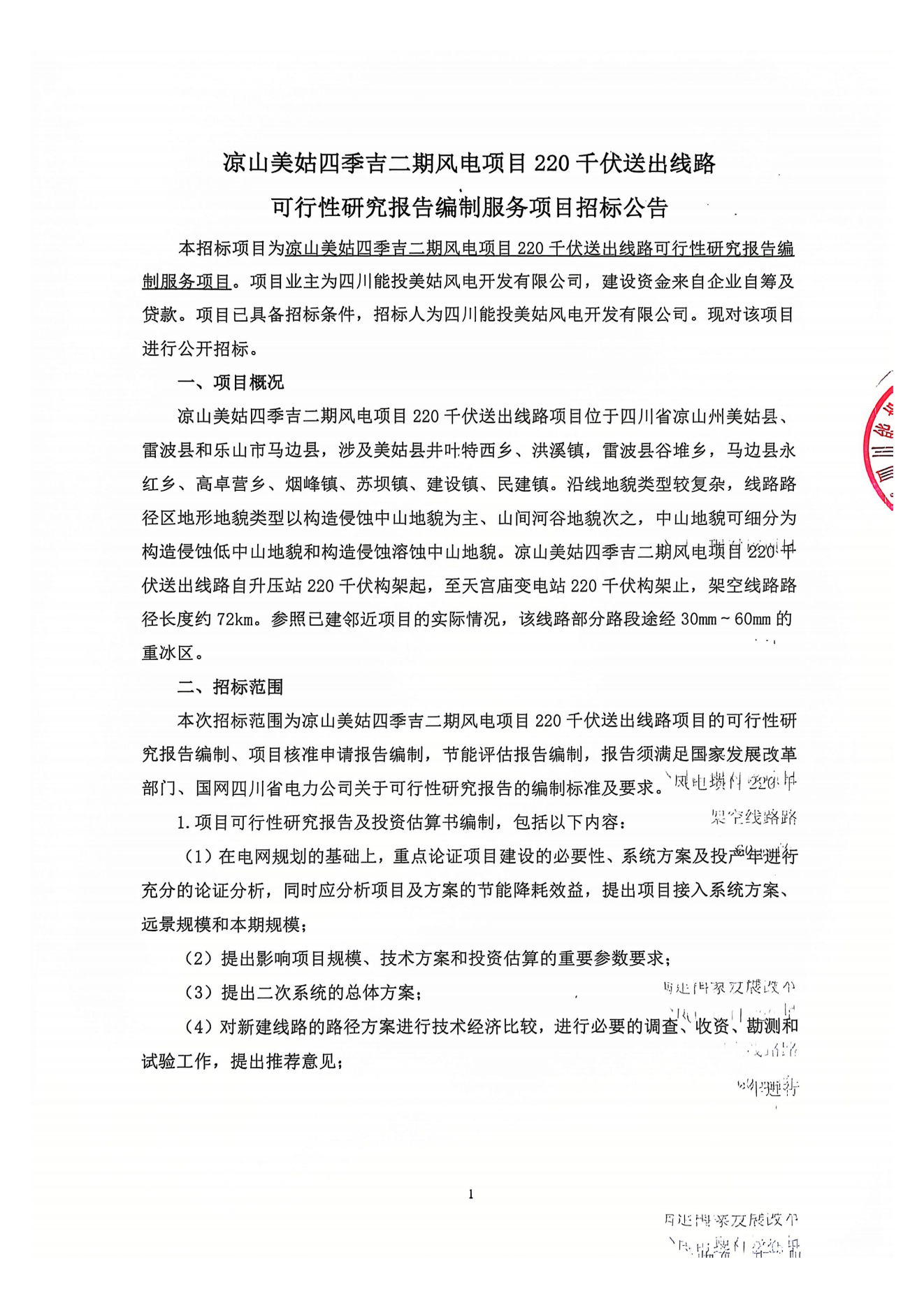 本招标项目为凉山美姑四季吉二期风电项目220千伏送出线路可行性研究报告编制服务项目。项目业主为四川能投美姑风电开发有限公司,建设资金来自企业自筹及贷款。项目已具备招标条件,招标人为四川能投美姑风电开发有限公司。现对该项目进行公开招标。