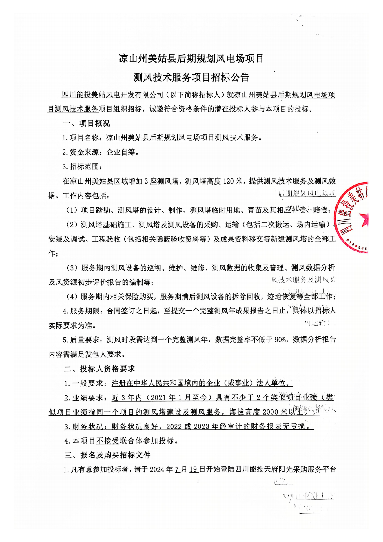 四川能投美姑风电开发有限公司(以下简称招标人)就凉山州美姑县后期规划风电场项目测风技术服务项目组织招标,诚邀符合资格条件的潜在投标人参与本项目的投标。