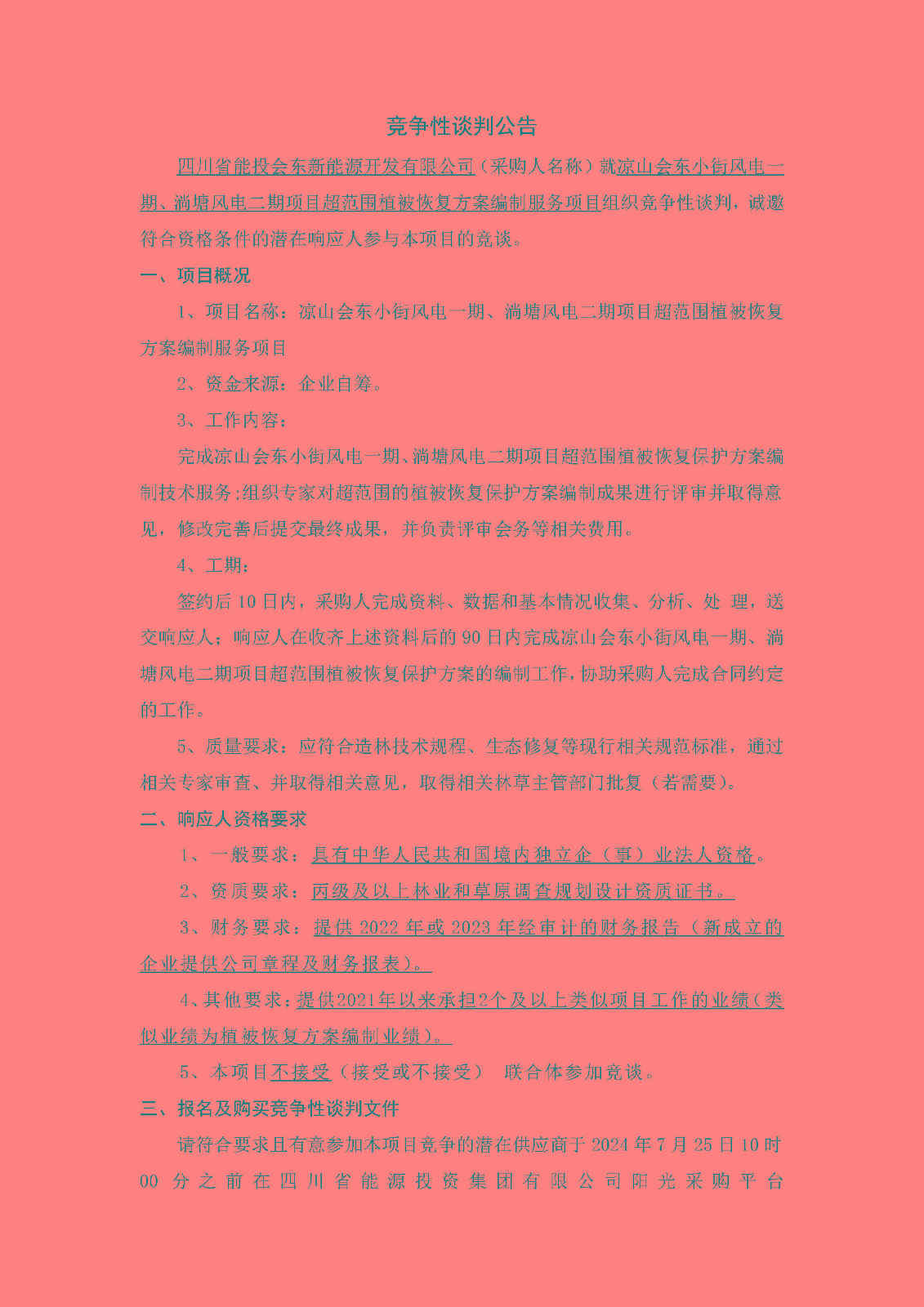 四川省能投会东新能源开发有限公司(采购人名称)就凉山会东小街风电一期、淌塘风电二期项目超范围植被恢复方案编制服务项目组织竞争性谈判,诚邀符合资格条件的潜在响应人参与本项目的竞谈。