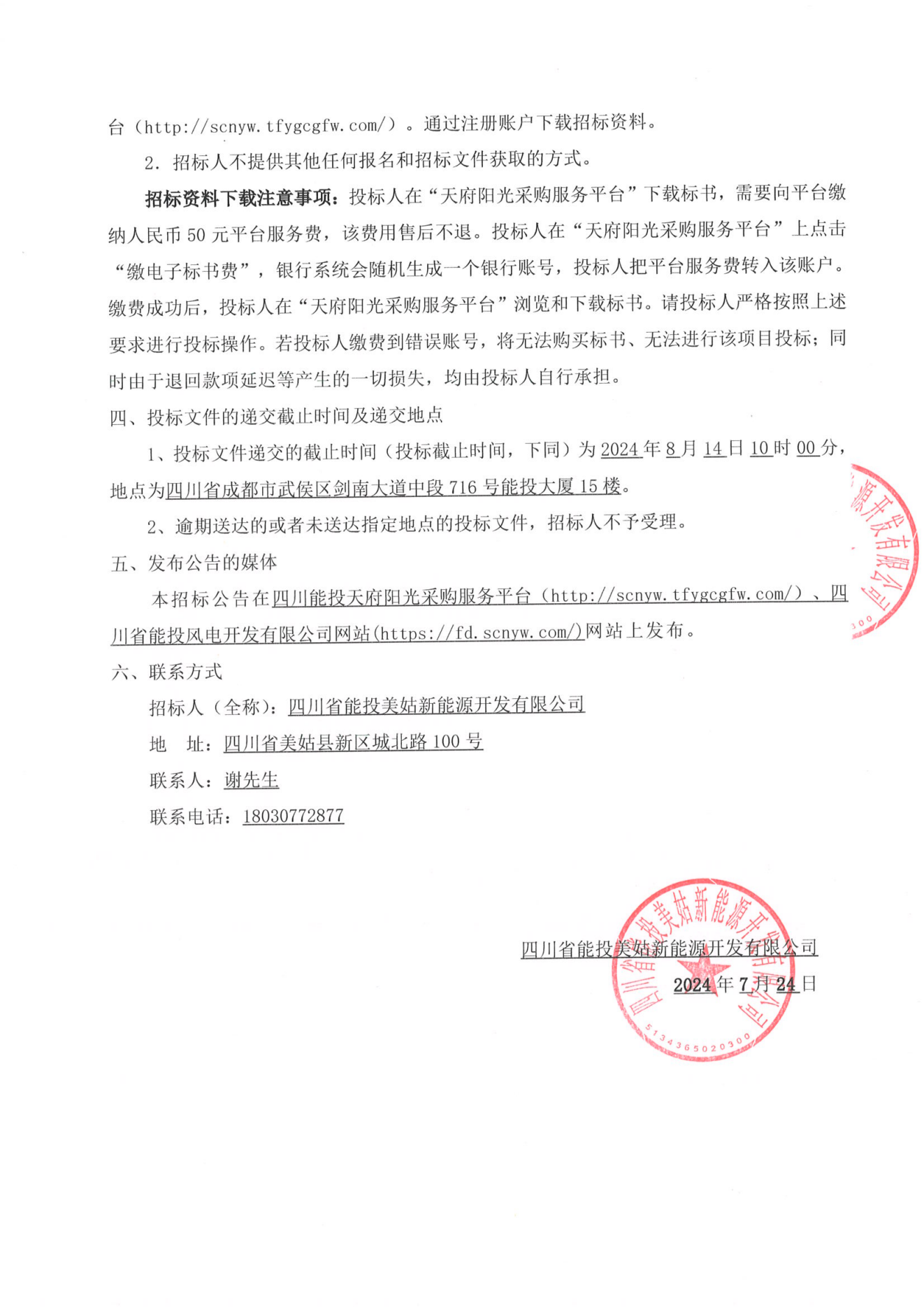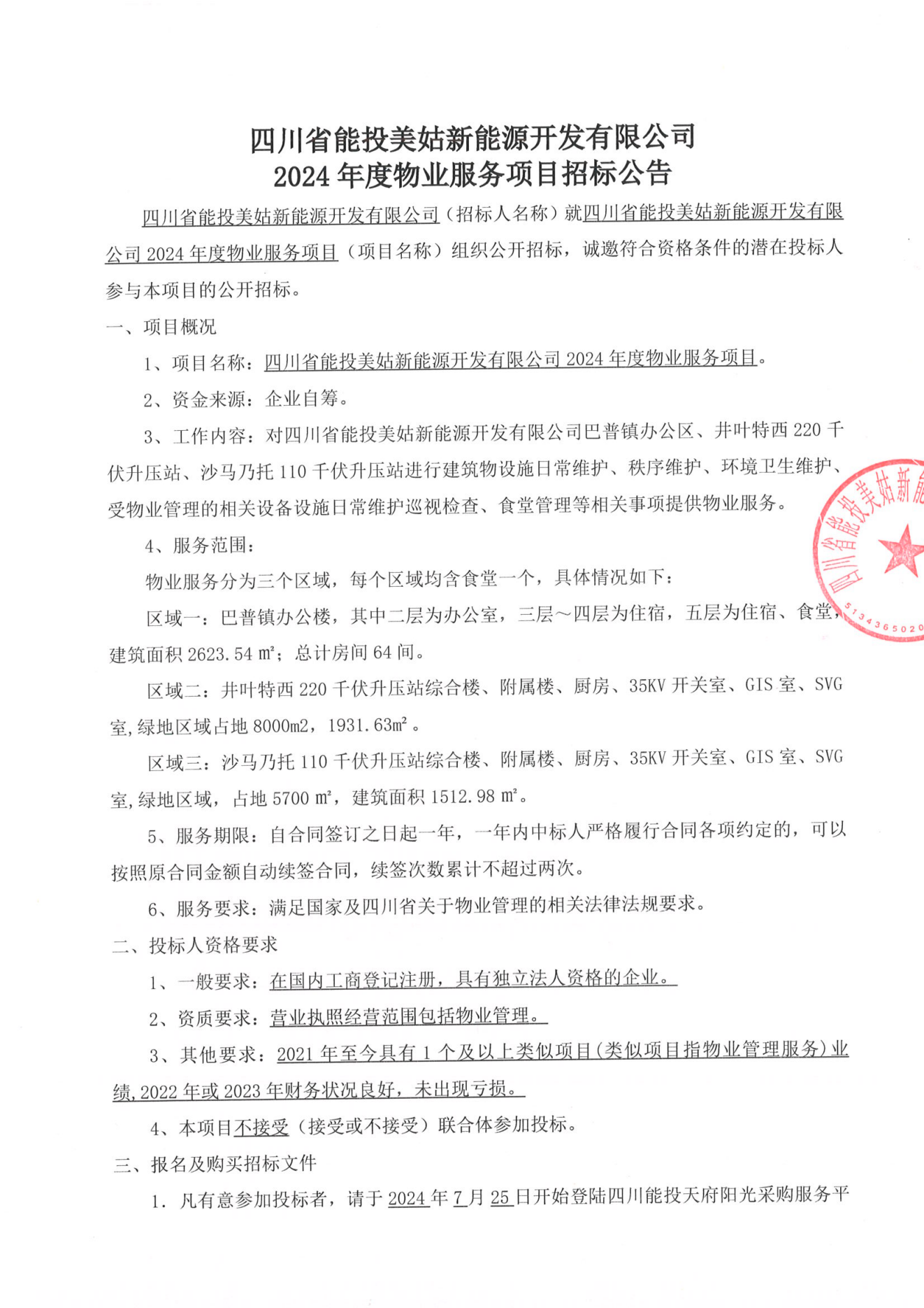 四川省能投美姑新能源开发有限公司(招标人名称)就四川省能投美姑新能源开发有限公司2024年度物业服务项目(项目名称)组织公开招标,诚邀符合资格条件的潜在投标人参与本项目的公开招标。