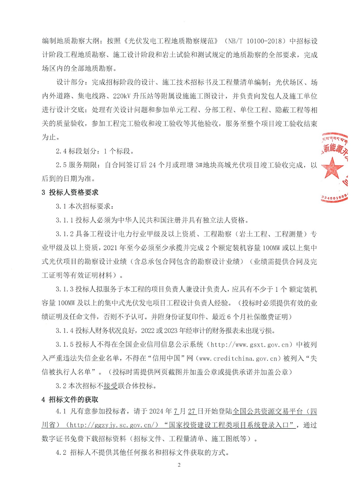 3.1.2具备工程设计电力行业甲级及以上资质、工程勘察(岩土工程、工程测量)专业甲级及以上资质,2021年至今必须至少承揽并完成2个额定装机容量100MW或以上集中式光伏项目的勘察设计业绩(含总承包合同包含的勘察设计业绩)(业绩需提供合同及完工证明等有效证明材料)。