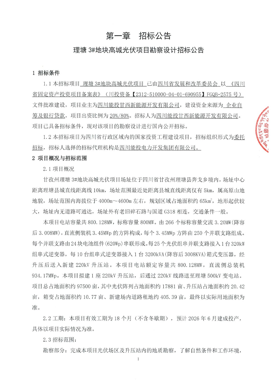 1.1本招标项目 理塘3#地块高城光伏项目 已由四川省发展和改革委员会 以 《四川省固定资产投资项目备案表》(川投资备【2312-510000-04-01-690955】FGQB-2575号)文件批准建设,项目业主为四川能投甘西新能源开发有限公司,建设资金来源为 企业自筹及银行贷款,项目出资比例为20%/80%。招标人为四川能投甘西新能源开发有限公司。项目已具备招标条件,现对该项目的勘察设计进行国内公开招标。