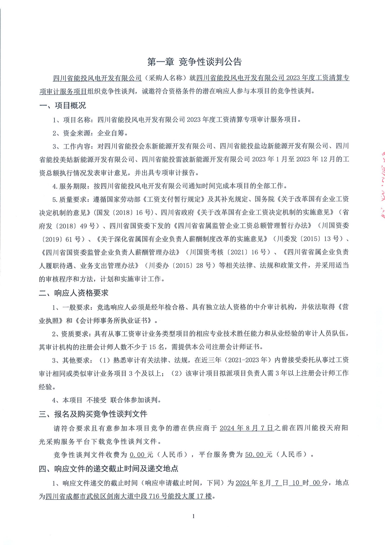 3、工作内容:对四川省能投会东新能源开发有限公司、四川省能投盐边新能源开发有限公司、四川省能投美姑新能源开发有限公司、四川省能投雷波新能源开发有限公司2023年1月至2023年12月的工资总额执行情况发表审计意见,并出具专项审计报告。