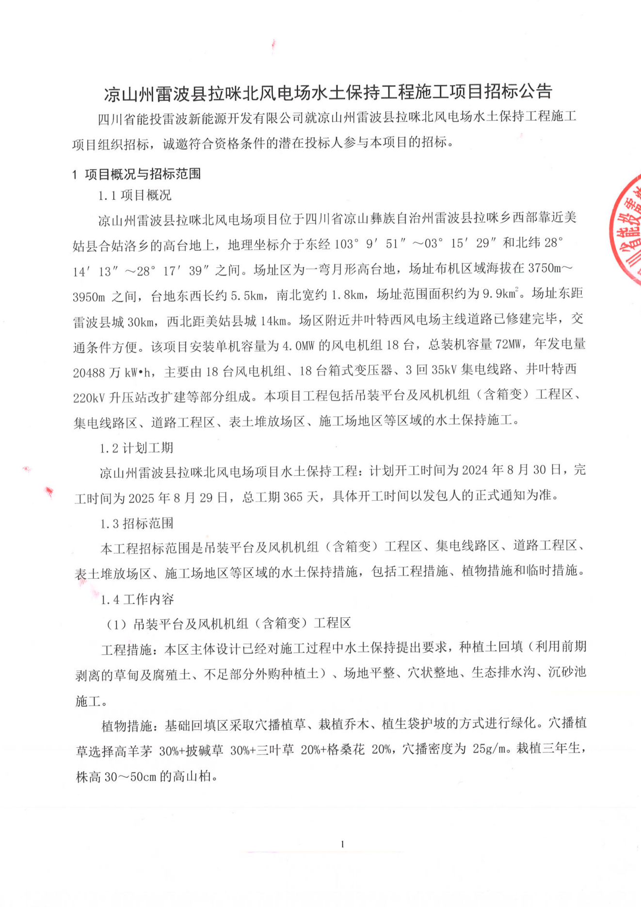 四川省能投雷波新能源开发有限公司就凉山州雷波县拉咪北风电场水土保持工程施工项目组织招标,诚邀符合资格条件的潜在投标人参与本项目的招标。
