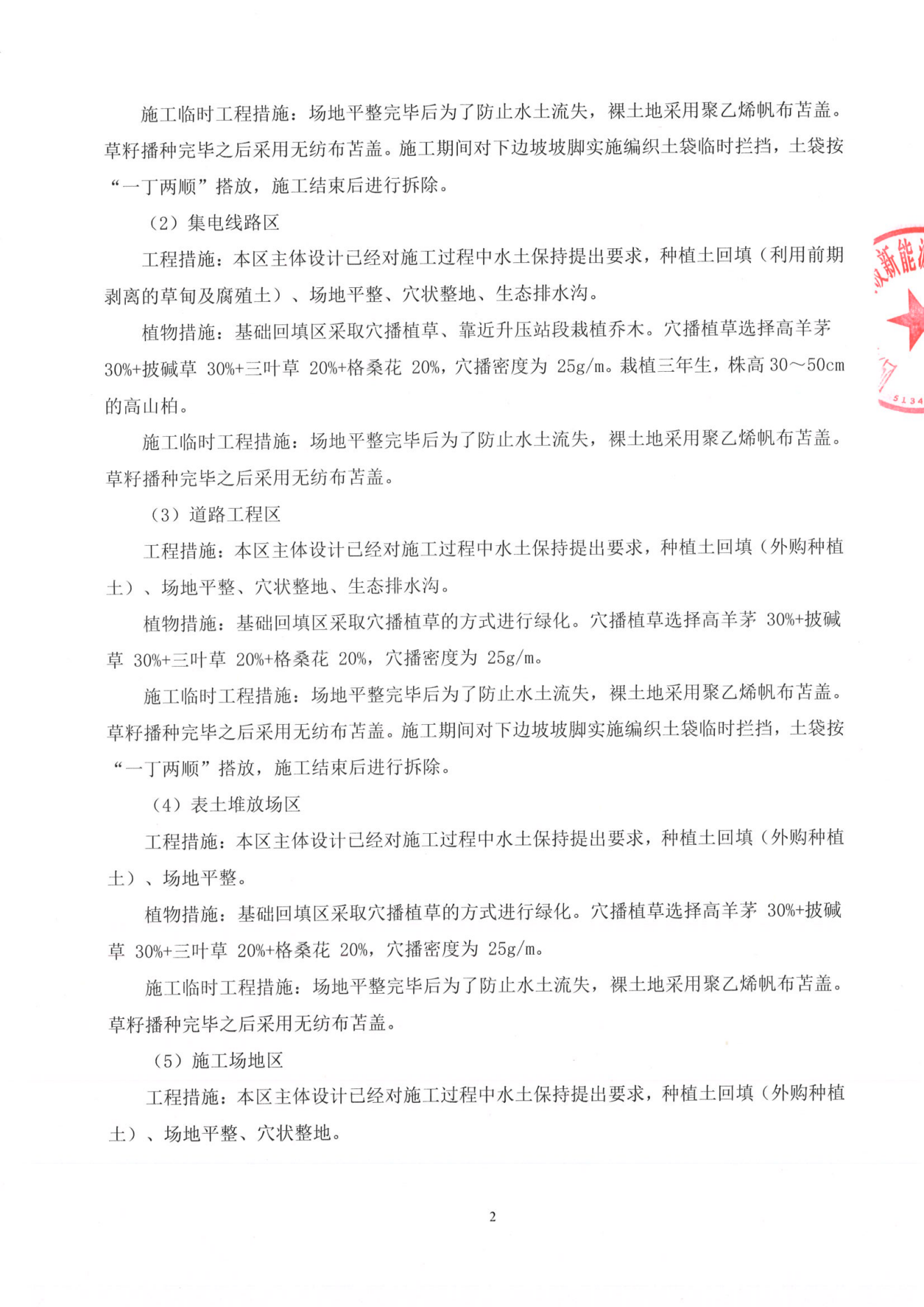 植物措施:基础回填区采取穴播植草、靠近升压站段栽植乔木。穴播植草选择高羊茅 30%+披碱草 30%+三叶草 20%+格桑花 20%,穴播密度为 25g/m。栽植三年生,株高30~50cm的高山柏。