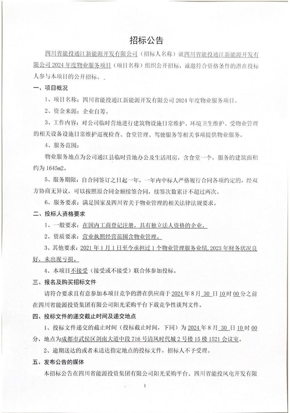 四川省能投通江新能源开发有限公司(招标人名称)就四川省能投通江新能源开发有限公司2024年度物业服务项目(项目名称)组织公开招标,诚邀符合资格条件的潜在投标人参与本项目的公开招标。