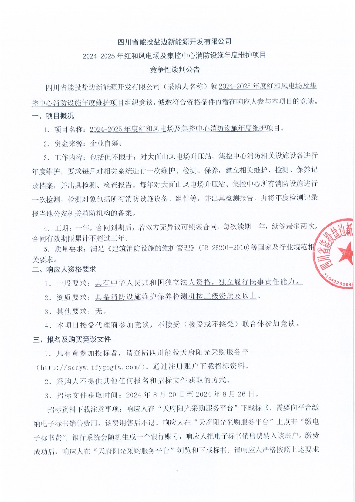 四川省能投盐边新能源开发有限公司(采购人名称)就2024-2025年度红和风电场及集控中心消防设施年度维护项目组织竞谈,诚邀符合资格条件的潜在响应人参与本项目的竞谈。