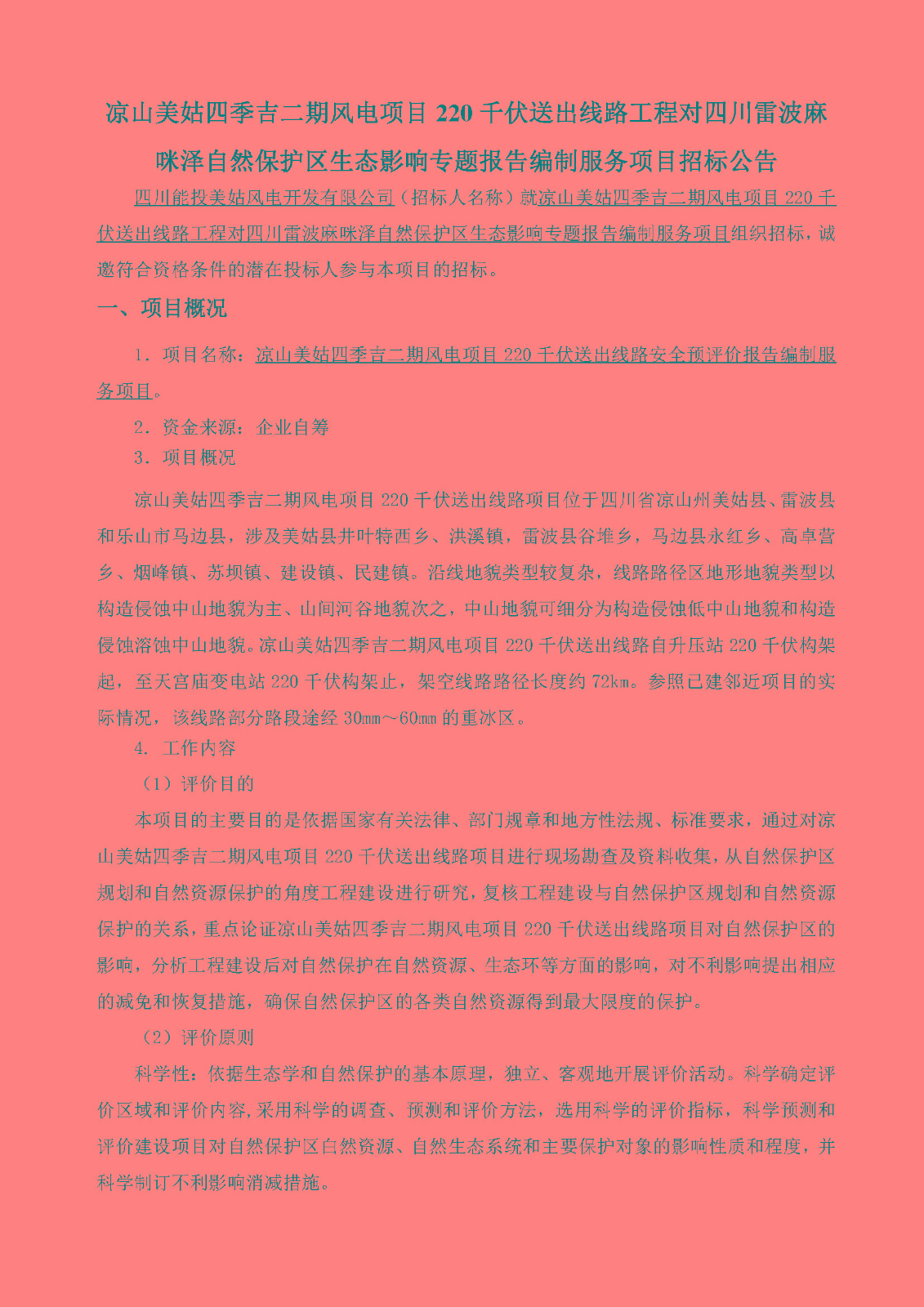 四川能投美姑风电开发有限公司(招标人名称)就凉山美姑四季吉二期风电项目220千伏送出线路工程对四川雷波麻咪泽自然保护区生态影响专题报告编制服务项目组织招标,诚邀符合资格条件的潜在投标人参与本项目的招标。