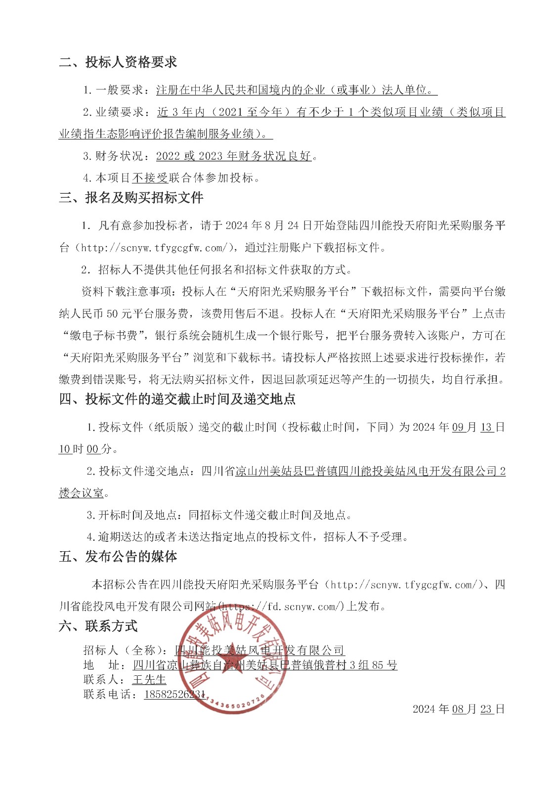 2.投标文件递交地点:四川省凉山州美姑县巴普镇四川能投美姑风电开发有限公司2楼会议室。