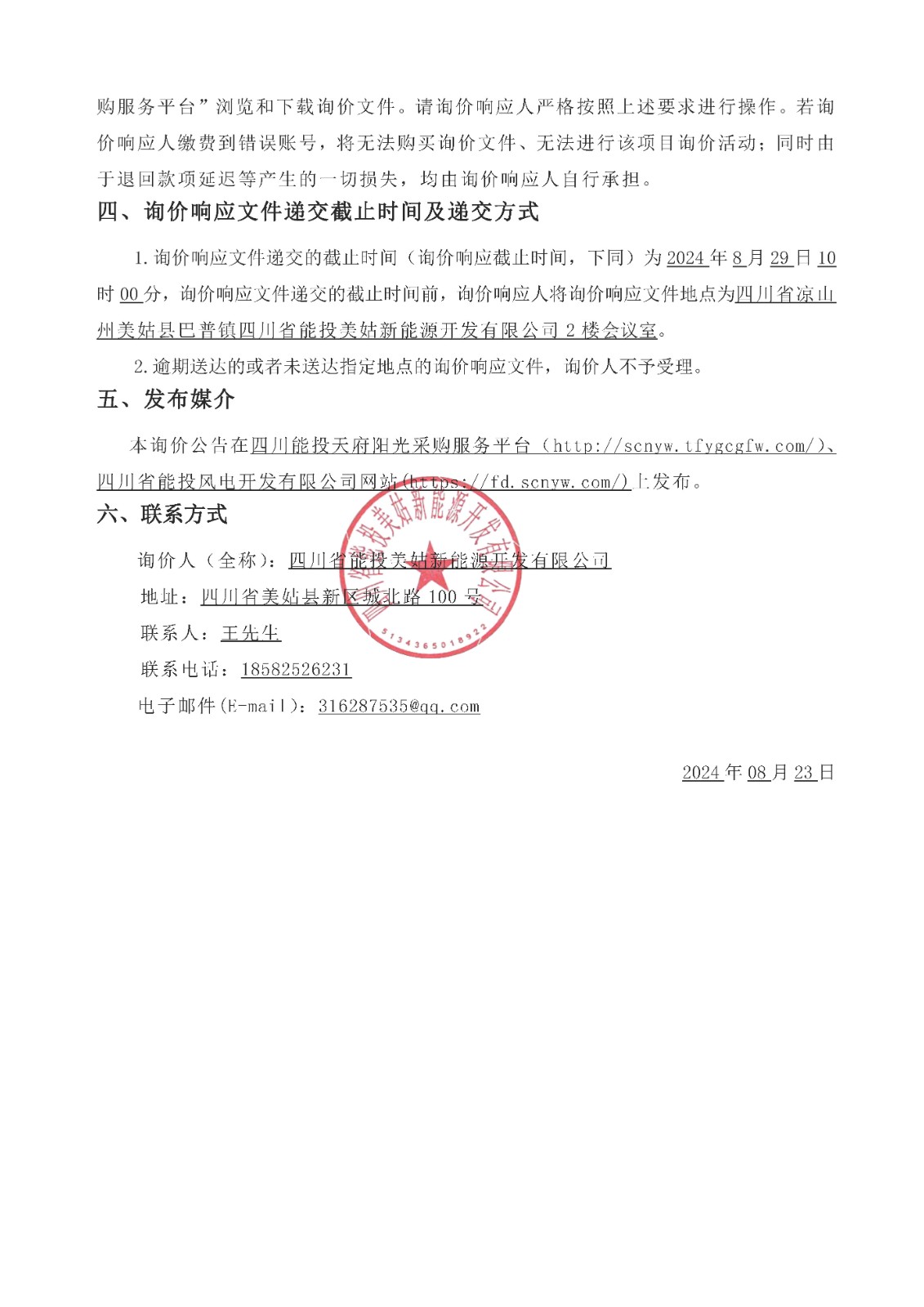 1.询价响应文件递交的截止时间(询价响应截止时间,下同)为2024年8月29日10时00分,询价响应文件递交的截止时间前,询价响应人将询价响应文件地点为四川省凉山州美姑县巴普镇四川省能投美姑新能源开发有限公司2楼会议室。