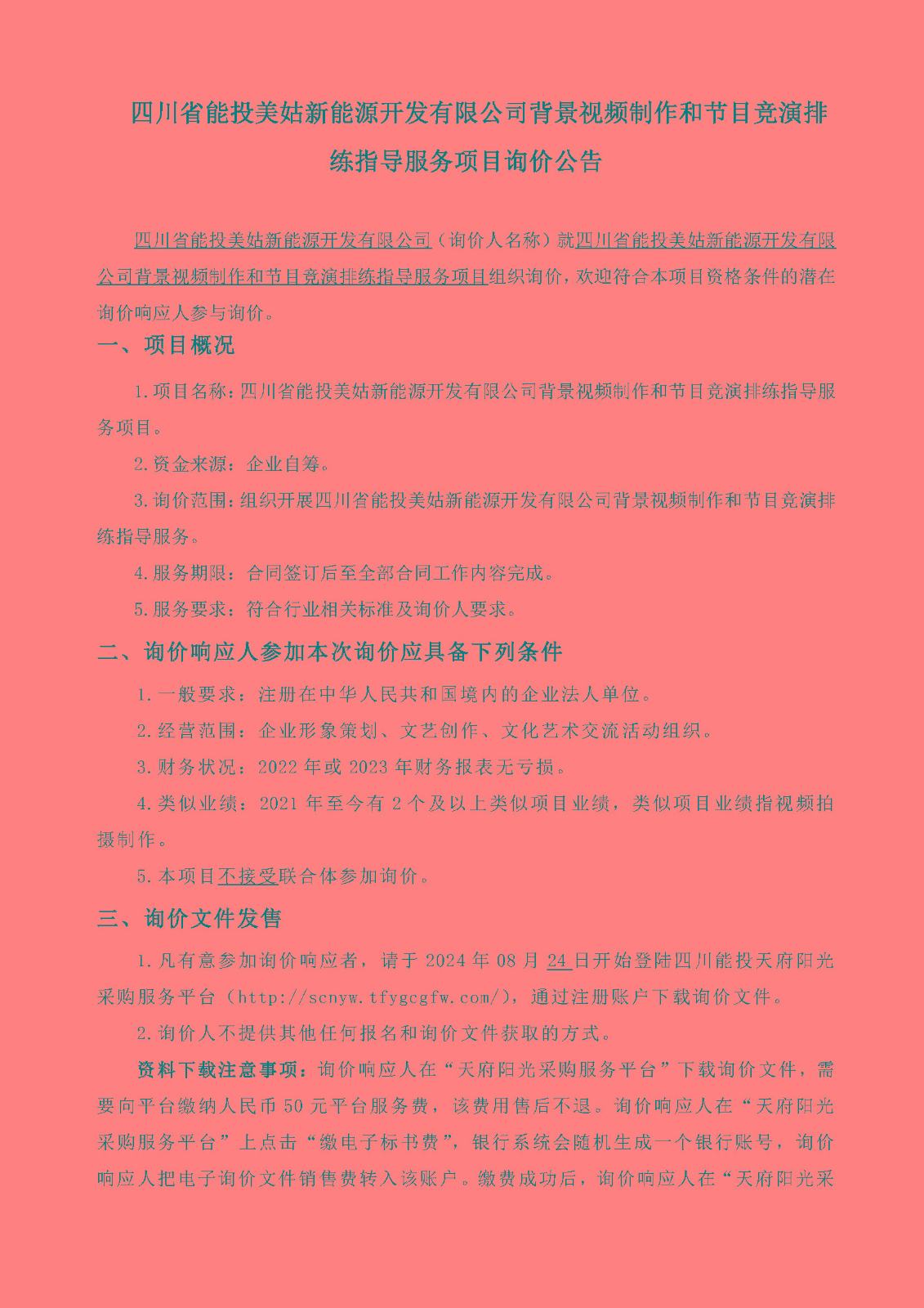 四川省能投美姑新能源开发有限公司(询价人名称)就四川省能投美姑新能源开发有限公司背景视频制作和节目竞演排练指导服务项目组织询价,欢迎符合本项目资格条件的潜在询价响应人参与询价。