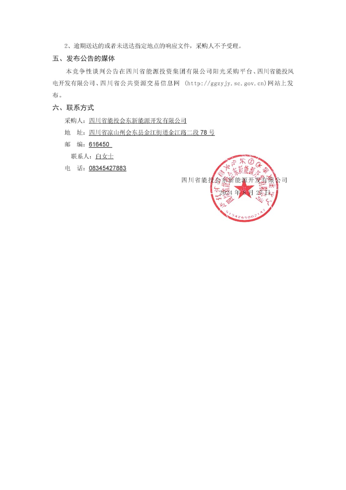 1、响应文件递交的截止时间(响应申请截止时间,下同)为2024年9月6日10时00分,地点为四川省凉山州会东县金江街道金江路二段78号四川省能投会东新能源开发有限公司2楼会议室。