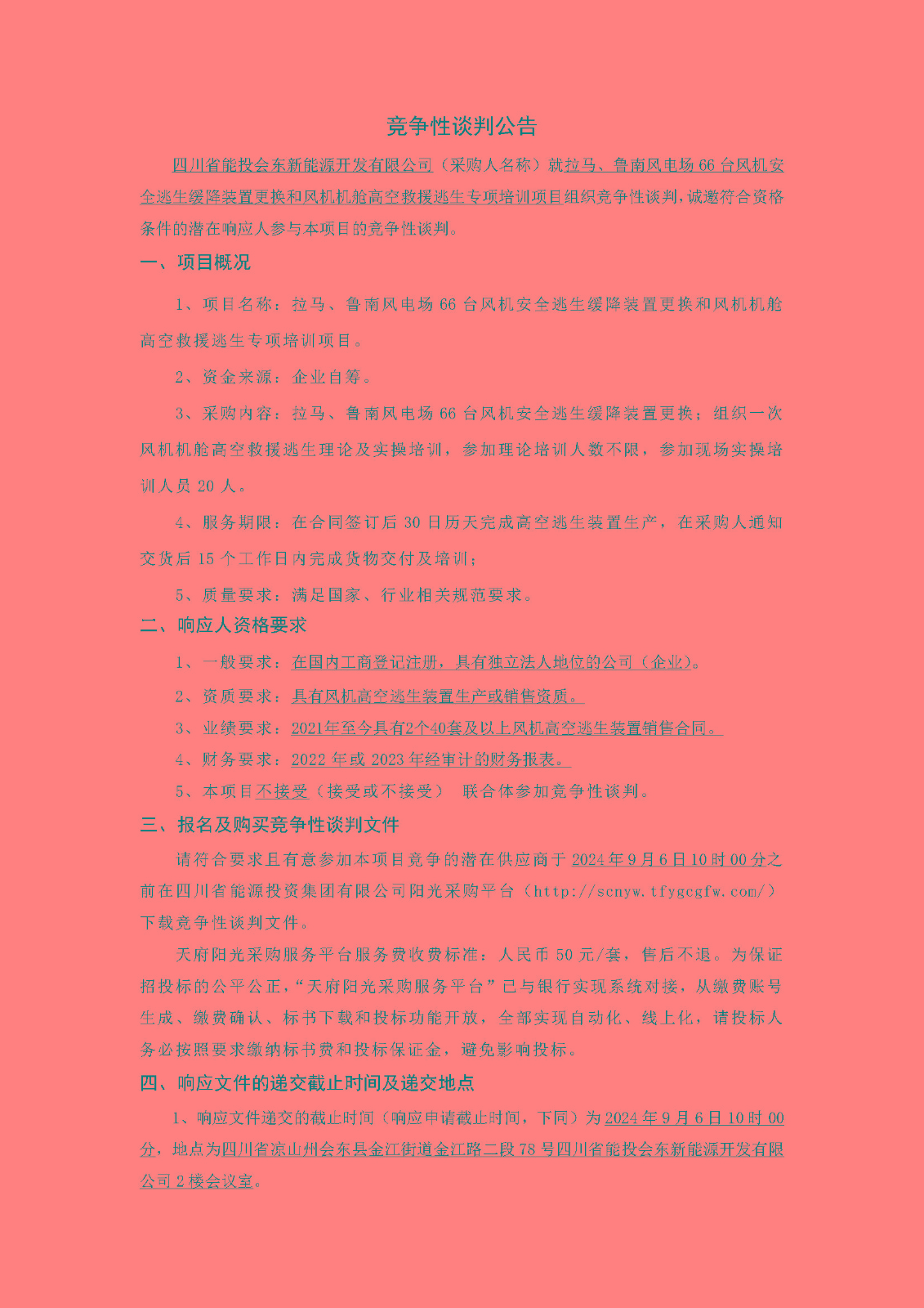 四川省能投会东新能源开发有限公司(采购人名称)就拉马、鲁南风电场66台风机安全逃生缓降装置更换和风机机舱高空救援逃生专项培训项目组织竞争性谈判,诚邀符合资格条件的潜在响应人参与本项目的竞争性谈判。