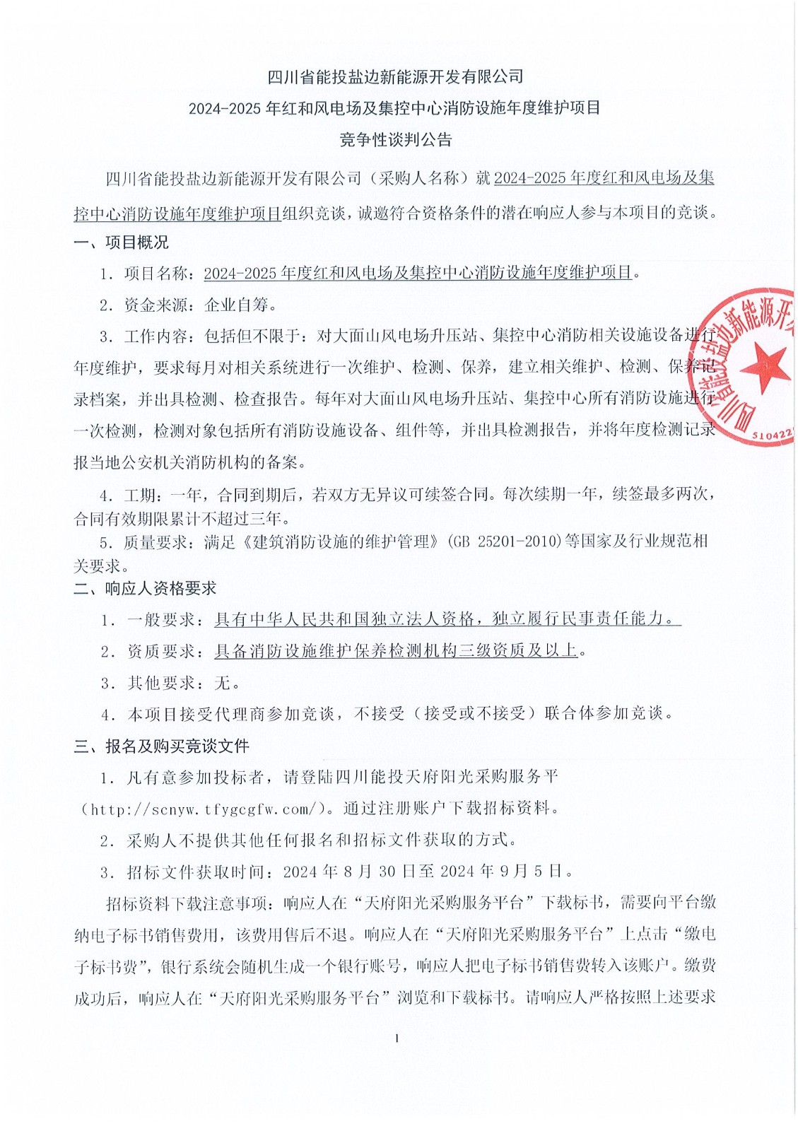 四川省能投盐边新能源开发有限公司(采购人名称)就2024-2025年度红和风电场及集控中心消防设施年度维护项目组织竞谈,诚邀符合资格条件的潜在响应人参与本项目的竞谈。