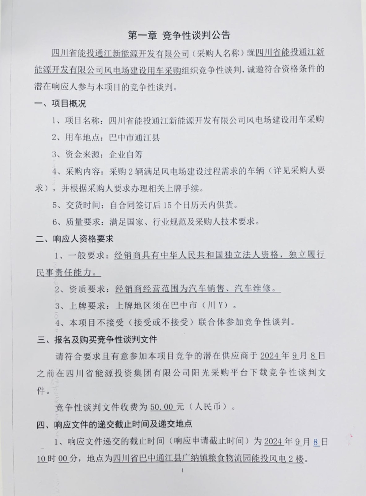 四川省能投通江新能源开发有限公司(采购人名称)就四川省能投通江新能源开发有限公司风电场建设用车采购组织竞争性谈判,诚邀符合资格条件的潜在响应人参与本项目的竞争性谈判。