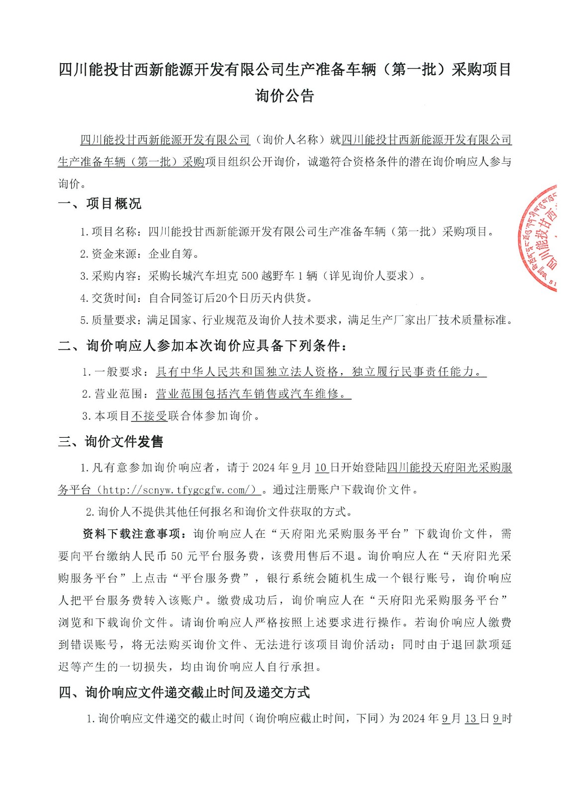 四川能投甘西新能源开发有限公司(询价人名称)就四川能投甘西新能源开发有限公司生产准备车辆(第一批)采购项目组织公开询价,诚邀符合资格条件的潜在询价响应人参与询价。