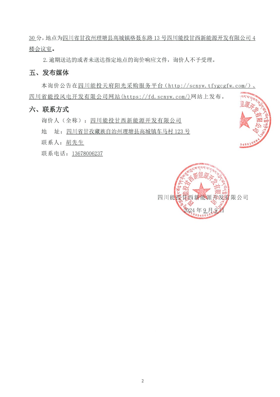 1.询价响应文件递交的截止时间(询价响应截止时间,下同)为2024年9月13日9时30分,地点为四川省甘孜州理塘县高城镇格聂东路13号四川能投甘西新能源开发有限公司4楼会议室。
