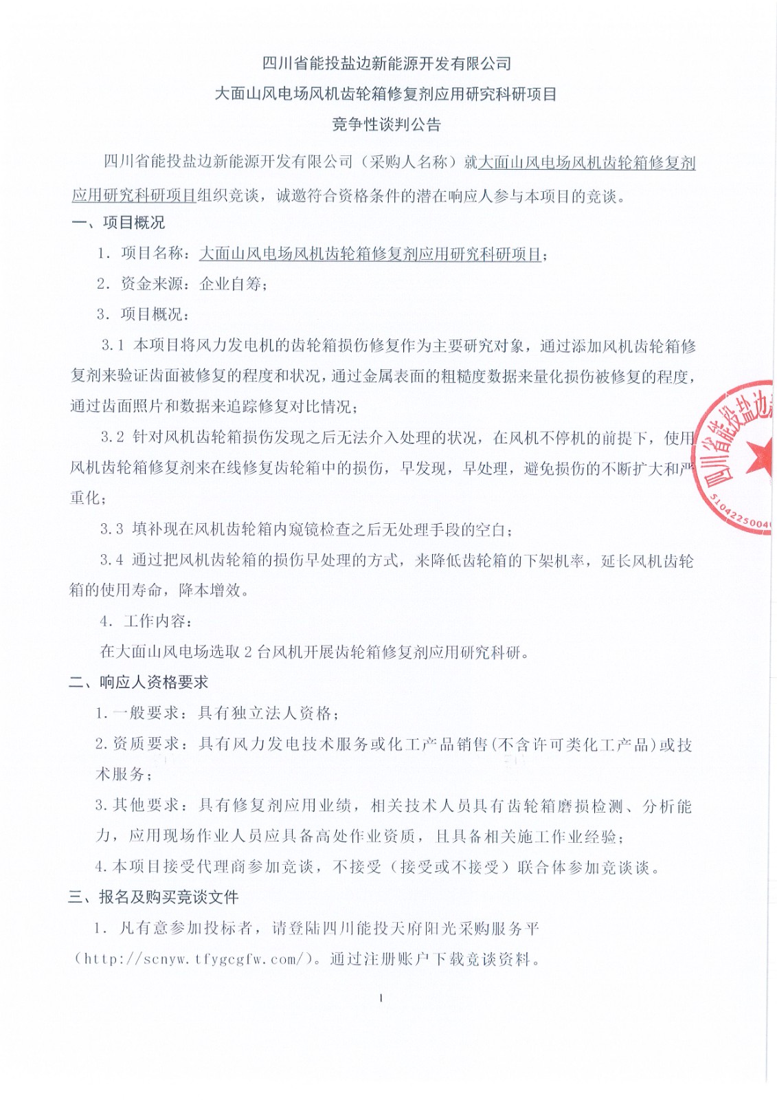 四川省能投盐边新能源开发有限公司(采购人名称)就大面山风电场风机齿轮箱修复剂应用研究科研项目组织竞谈,诚邀符合资格条件的潜在响应人参与本项目的竞谈。