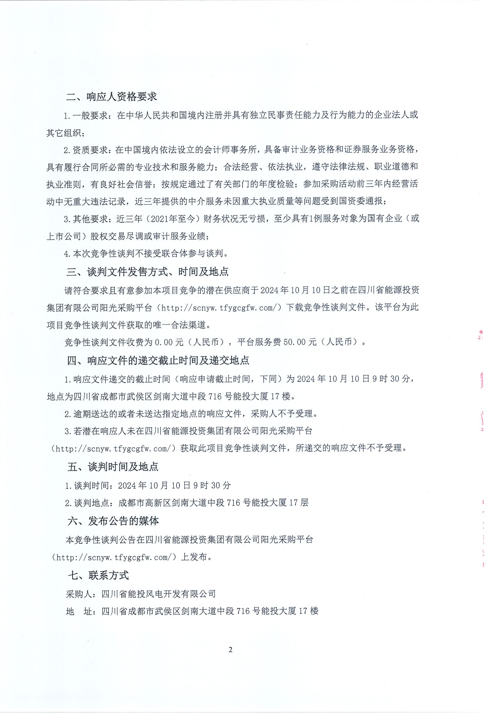 请符合要求且有意参加本项目竞争的潜在供应商于2024年10月10日之前在四川省能源投资集团有限公司阳光采购平台(http://scnyw.tfygcgfw.com/)下载竞争性谈判文件。该平台为此项目竞争性谈判文件获取的唯一合法渠道。