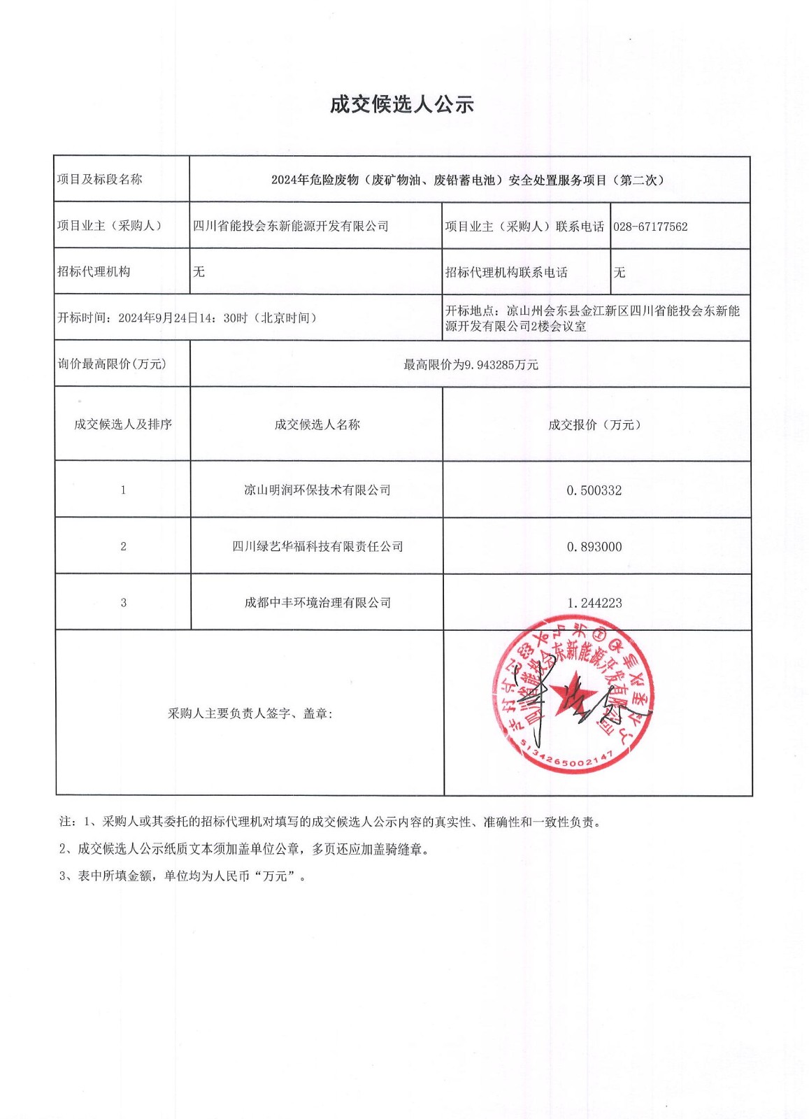四川省能投会东新能源开发有限公司关于2024年危险废物(废矿物油、废铅蓄电池)安全处置服务项目(第二次)的成交候选人公示