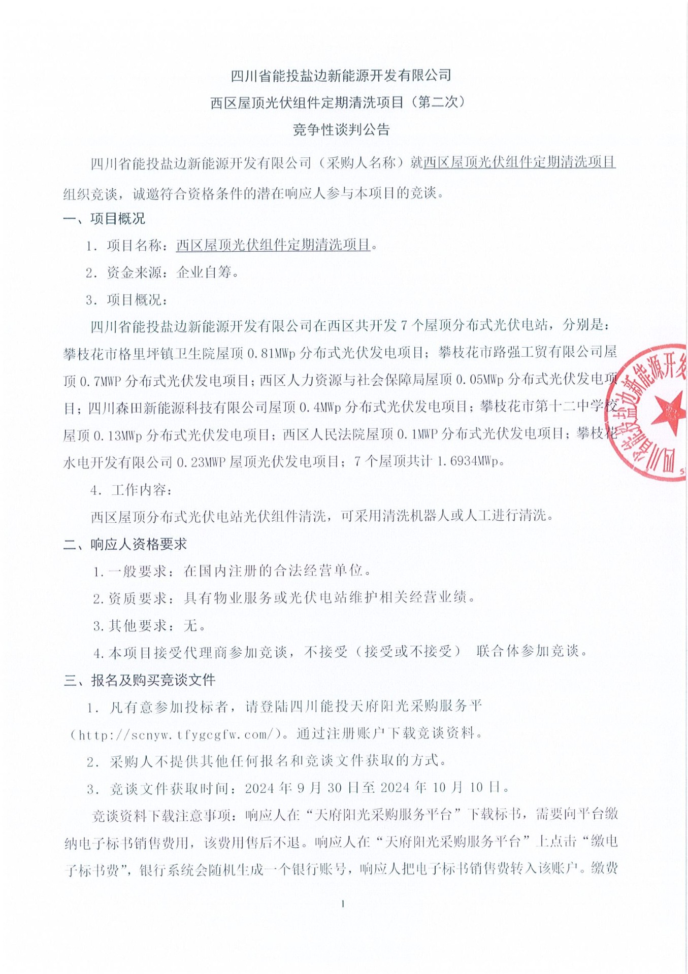 四川省能投盐边新能源开发有限公司(采购人名称)就西区屋顶光伏组件定期清洗项目组织竞谈,诚邀符合资格条件的潜在响应人参与本项目的竞谈。