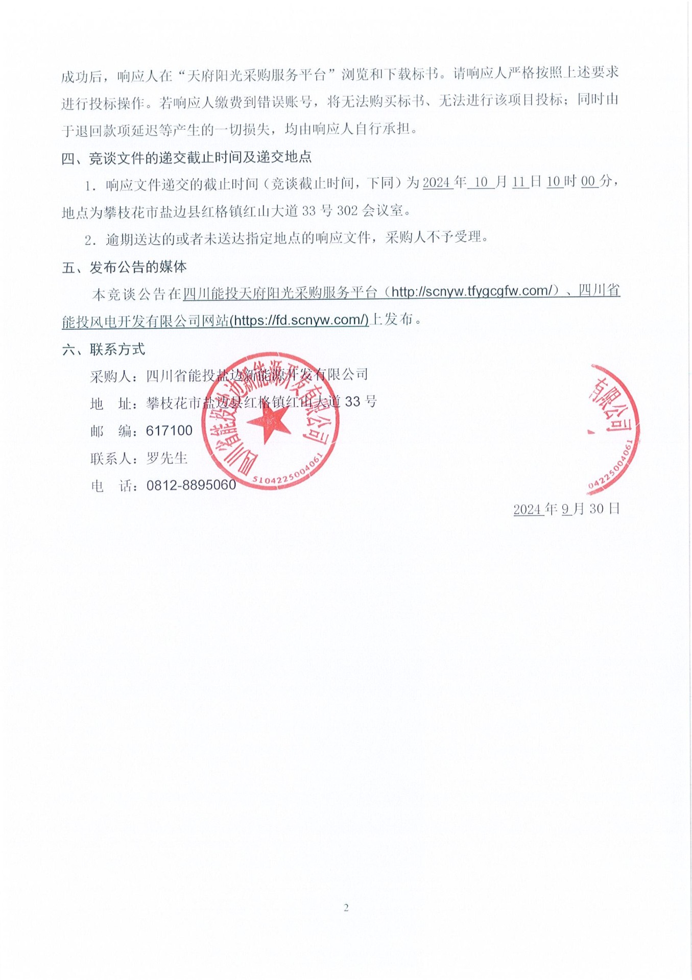 1.响应文件递交的截止时间(竞谈截止时间,下同)为2024年 10 月11日10时00分,地点为攀枝花市盐边县红格镇红山大道33号302会议室。