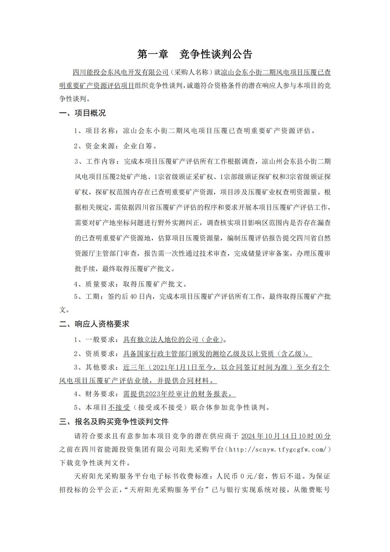 四川能投会东风电开发有限公司(采购人名称)就凉山会东小街二期风电项目压覆已查明重要矿产资源评估项目组织竞争性谈判,诚邀符合资格条件的潜在响应人参与本项目的竞争性谈判。