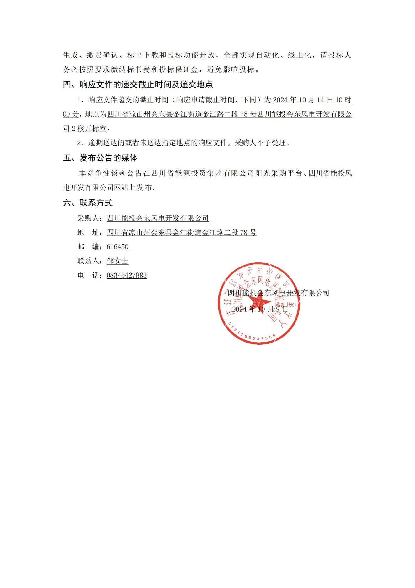 1、响应文件递交的截止时间(响应申请截止时间,下同)为2024年10月14日10时00分,地点为四川省凉山州会东县金江街道金江路二段78号四川能投会东风电开发有限公司2楼开标室。