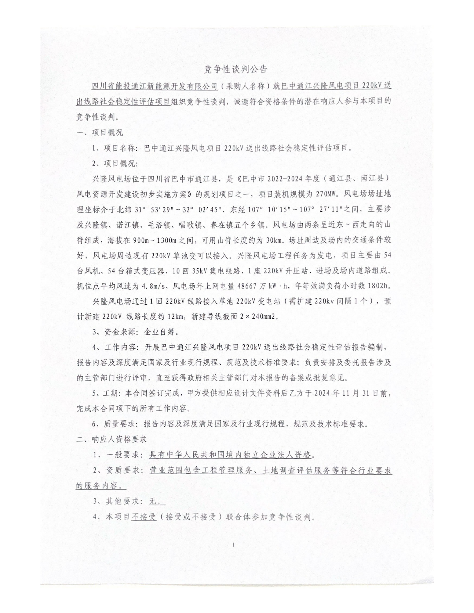 四川省能投通江新能源开发有限公司(采购人名称)就巴中通江兴隆风电项目220kV送出线路社会稳定性评估项目组织竞争性谈判,诚邀符合资格条件的潜在响应人参与本项目的竞争性谈判。