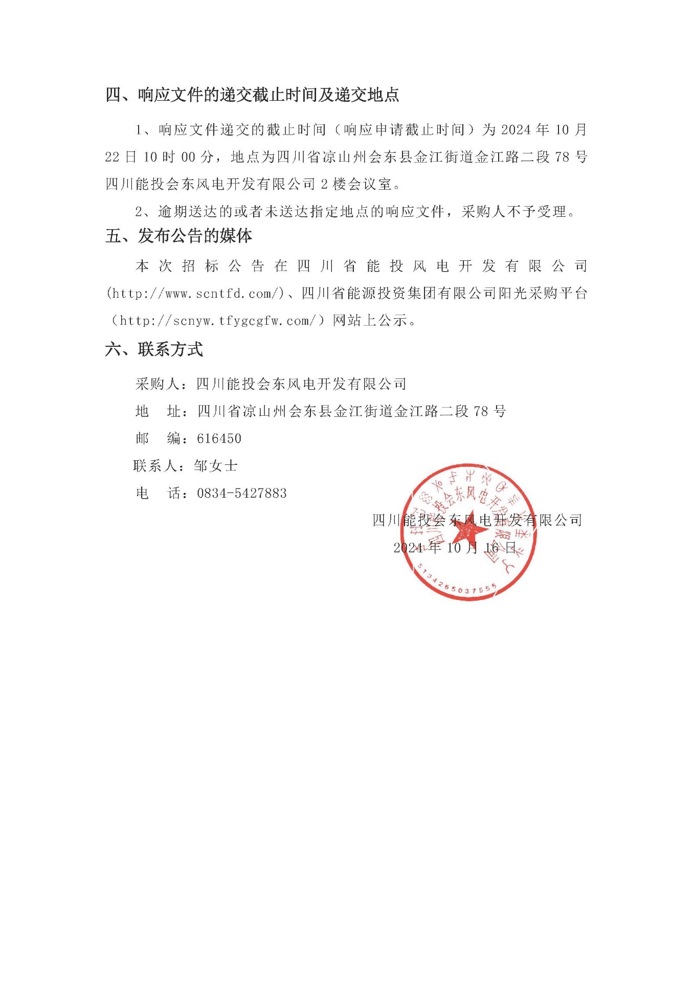 1、响应文件递交的截止时间(响应申请截止时间)为2024年10月22日10时00分,地点为四川省凉山州会东县金江街道金江路二段78号四川能投会东风电开发有限公司2楼会议室。