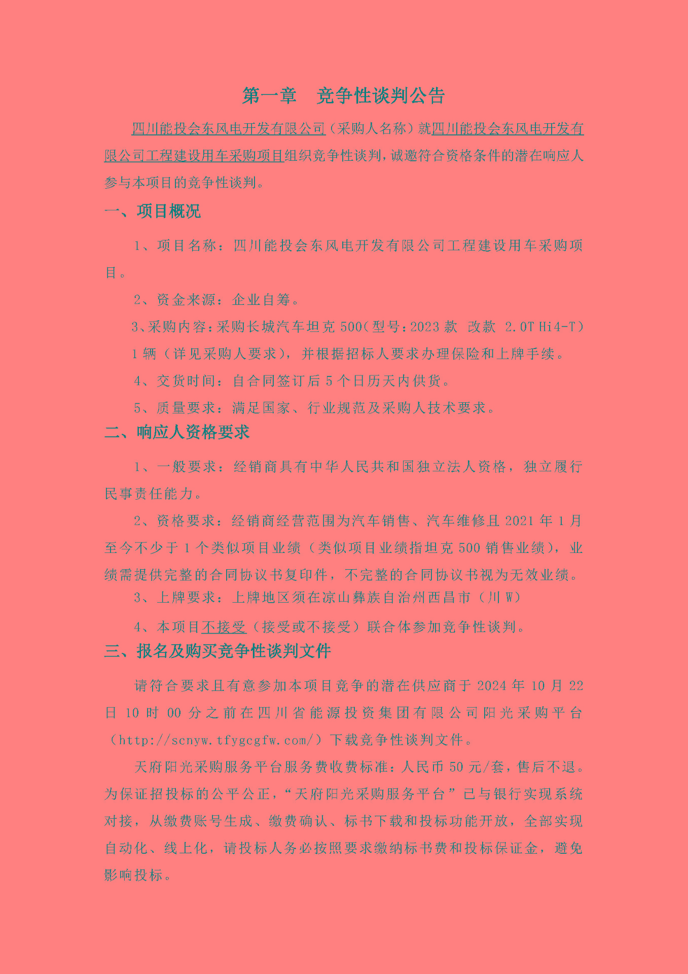 四川能投会东风电开发有限公司(采购人名称)就四川能投会东风电开发有限公司工程建设用车采购项目组织竞争性谈判,诚邀符合资格条件的潜在响应人参与本项目的竞争性谈判。