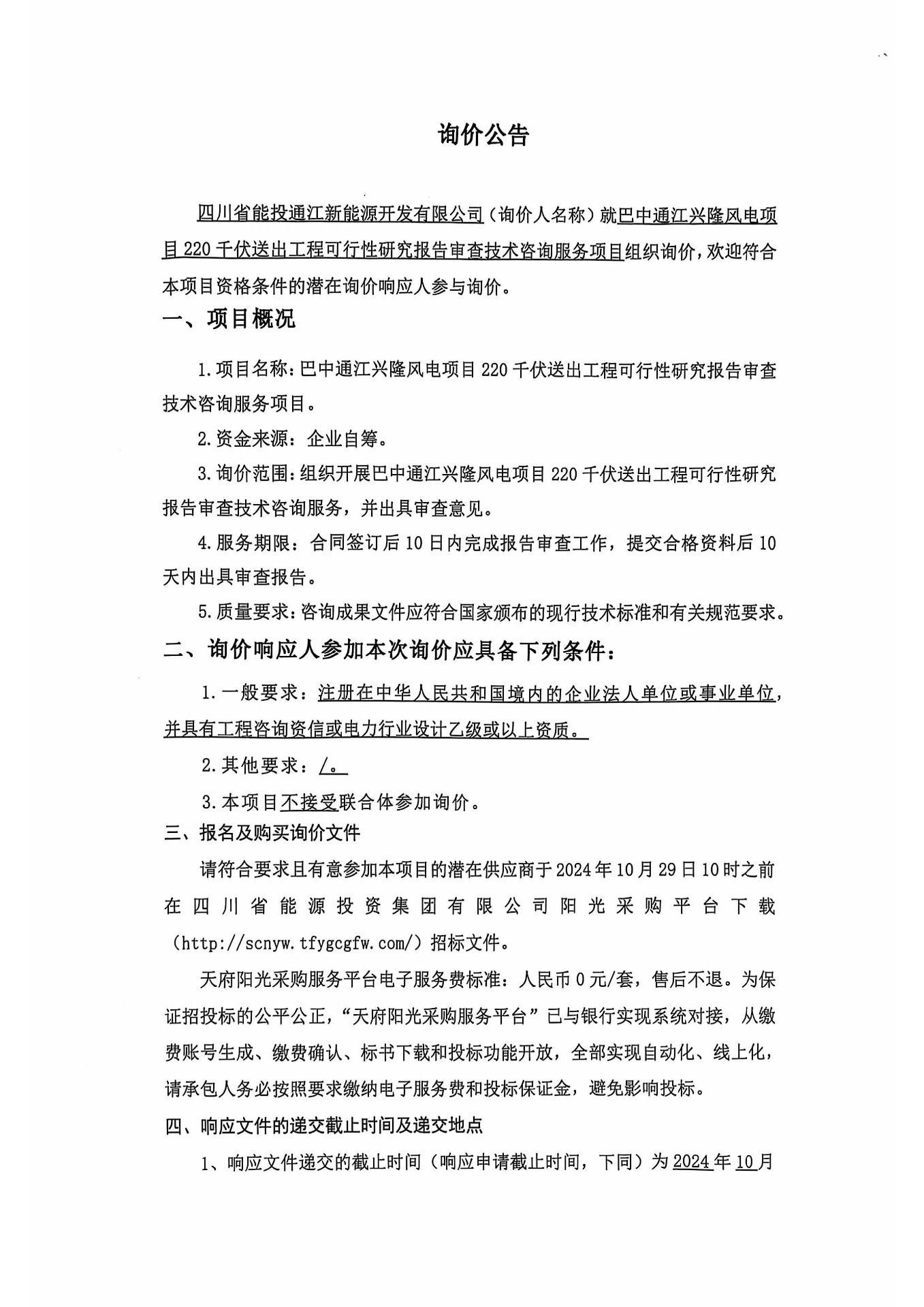 四川省能投通江新能源开发有限公司(询价人名称)就巴中通江兴隆风电项目220千伏送出工程可行性研究报告审查技术咨询服务项目组织询价,欢迎符合本项目资格条件的潜在询价响应人参与询价。