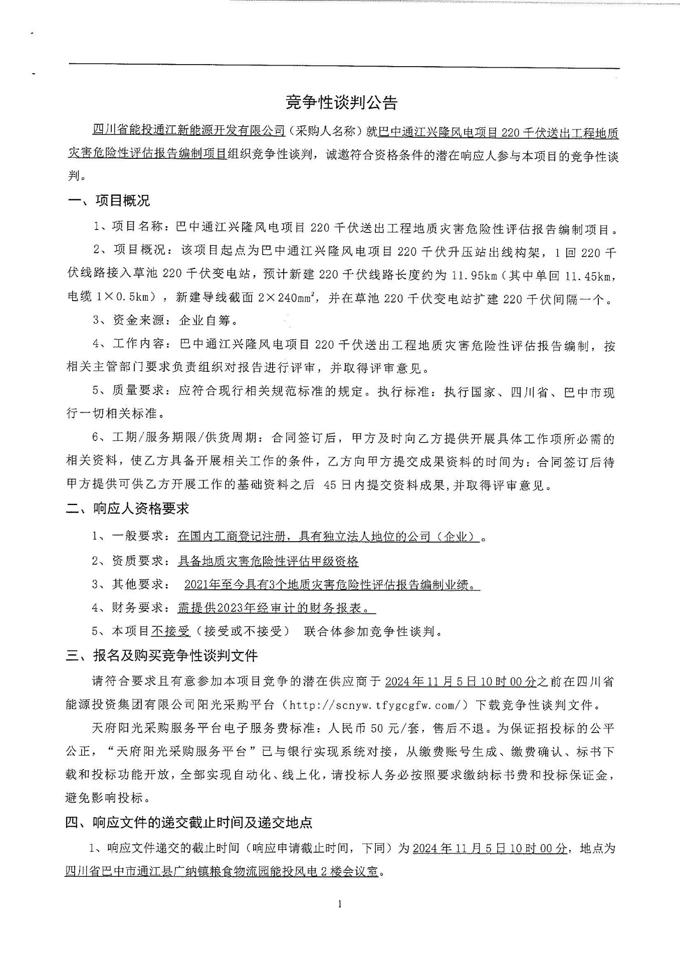 四川省能投通江新能源开发有限公司(采购人名称)就巴中通江兴隆风电项目220千伏送出工程地质灾害危险性评估报告编制项目组织竞争性谈判,诚邀符合资格条件的潜在响应人参与本项目的竞争性谈判。