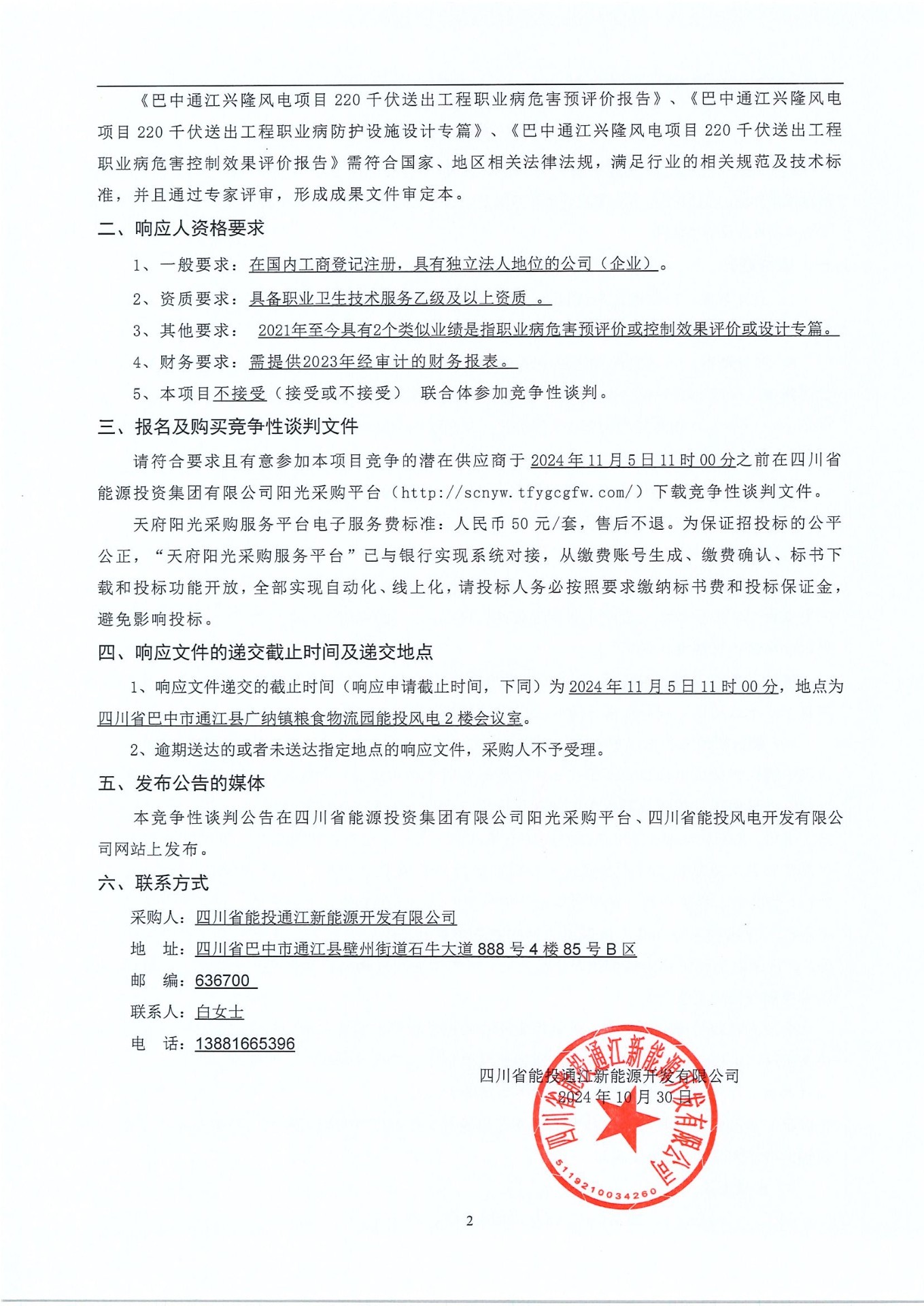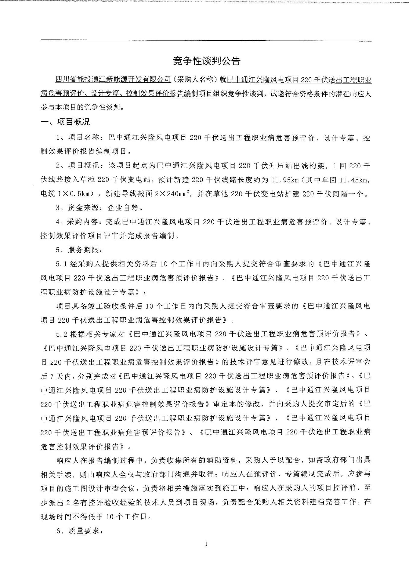 四川省能投通江新能源开发有限公司(采购人名称)就巴中通江兴隆风电项目220千伏送出工程职业病危害预评价、设计专篇、控制效果评价报告编制项目组织竞争性谈判,诚邀符合资格条件的潜在响应人参与本项目的竞争性谈判。