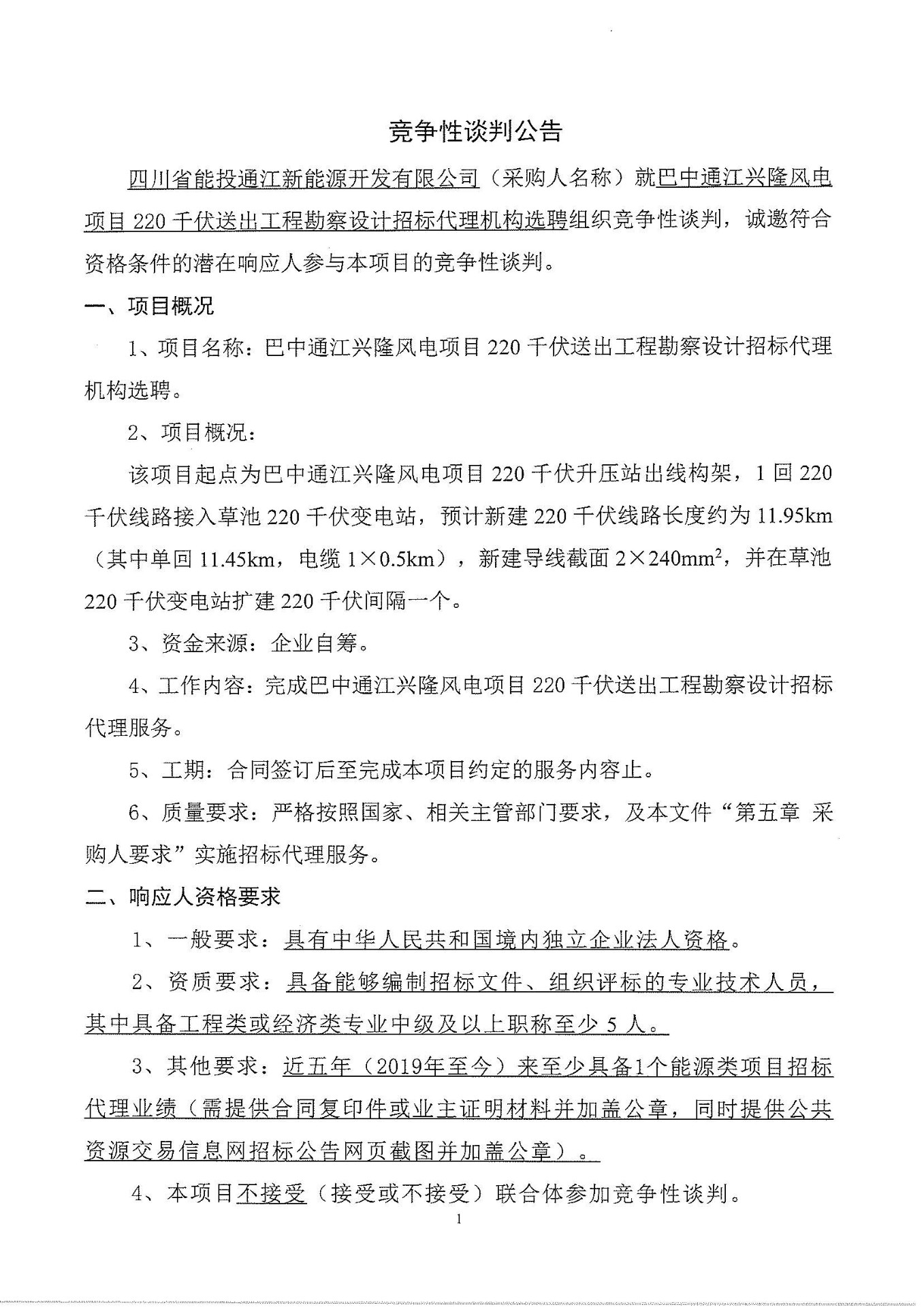 四川省能投通江新能源开发有限公司(采购人名称)就巴中通江兴隆风电项目220千伏送出工程勘察设计招标代理机构选聘组织竞争性谈判,诚邀符合资格条件的潜在响应人参与本项目的竞争性谈判。