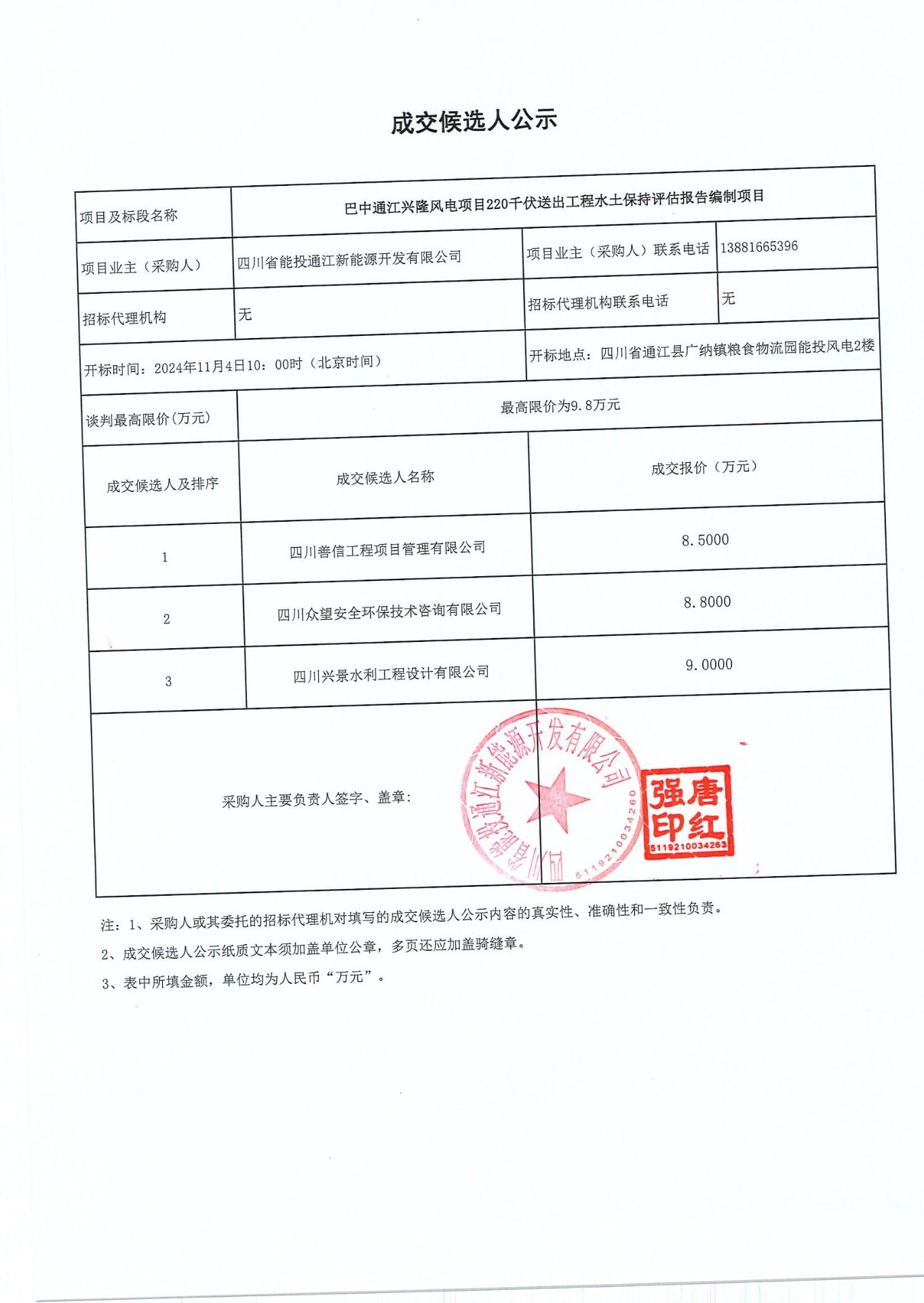 下一条:四川省能投通江新能源开发有限公司关于巴中通江兴隆风电项目220千伏送出工程环境影响评价报告编制项目的成交候选人公示