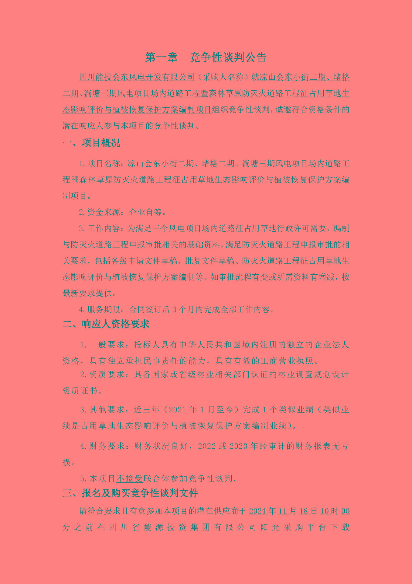 四川能投会东风电开发有限公司(采购人名称)就凉山会东小街二期、堵格二期、淌塘三期风电项目场内道路工程暨森林草原防灭火道路工程征占用草地生态影响评价与植被恢复保护方案编制项目组织竞争性谈判,诚邀符合资格条件的潜在响应人参与本项目的竞争性谈判。