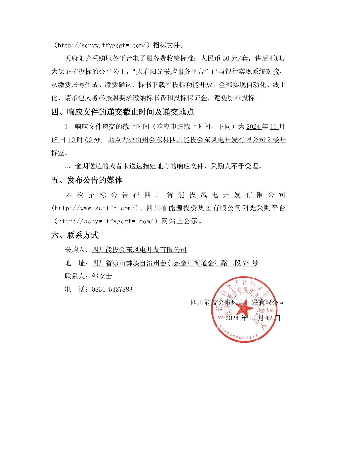 1、响应文件递交的截止时间(响应申请截止时间,下同)为2024年11月18日10时00分,地点为凉山州会东县四川能投会东风电开发有限公司2楼开标室。