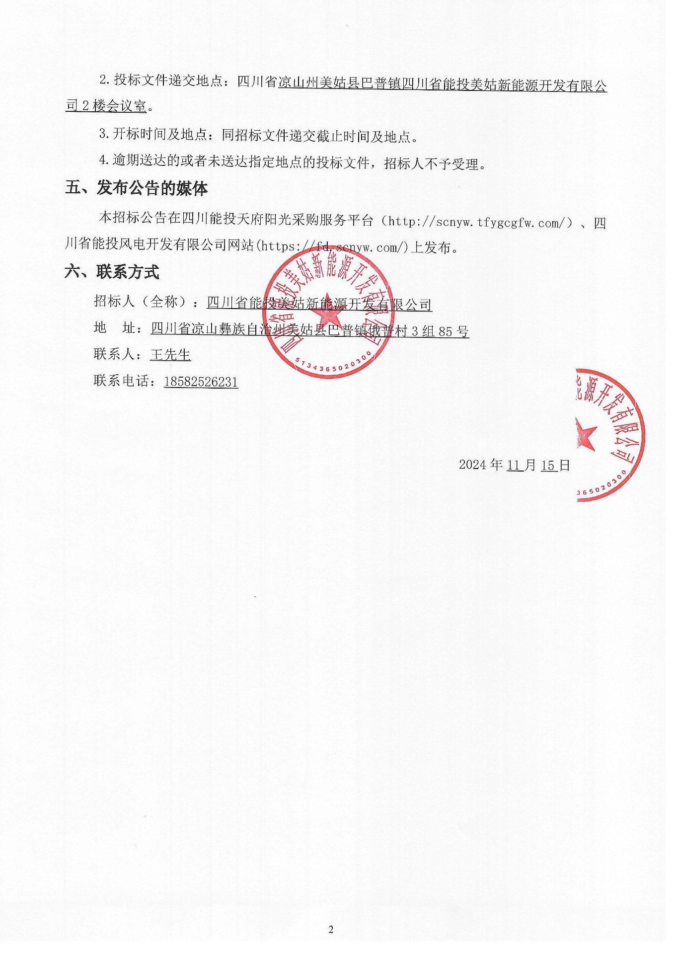 2.投标文件递交地点:四川省凉山州美姑县巴普镇四川省能投美姑新能源开发有限公司2楼会议室。