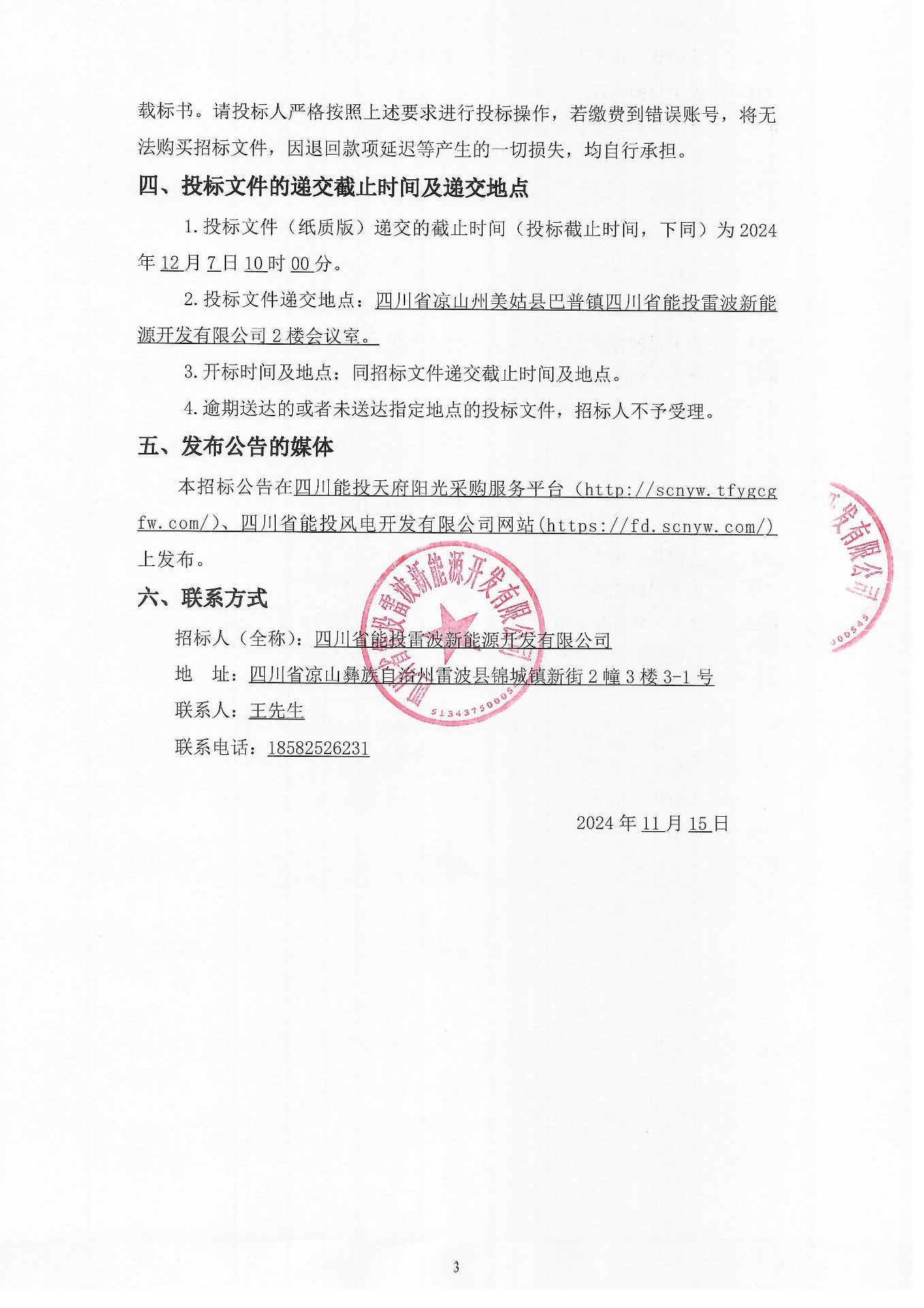 2.投标文件递交地点:四川省凉山州美姑县巴普镇四川省能投雷波新能源开发有限公司2楼会议室。