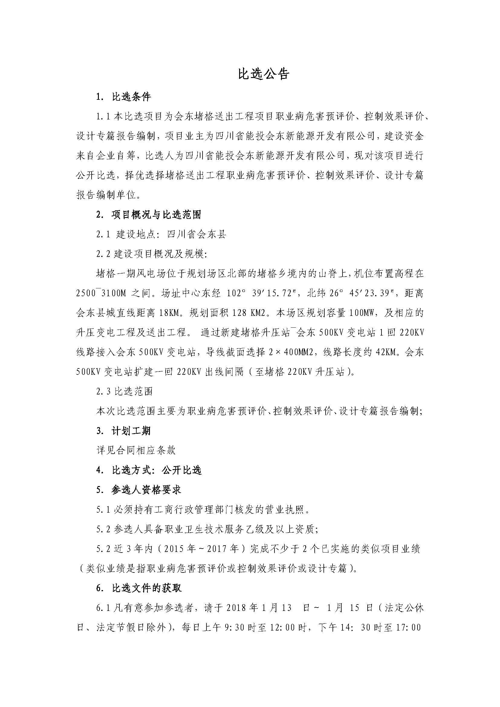 1.1本比选项目为会东堵格送出工程项目职业病危害预评价、控制效果评价、设计专篇报告编制,项目业主为四川省能投会东新能源开发有限公司,建设资金来自企业自筹,比选人为四川省能投会东新能源开发有限公司,现对该项目进行公开比选,择优选择堵格送出工程职业病危害预评价、控制效果评价、设计专篇报告编制单位。