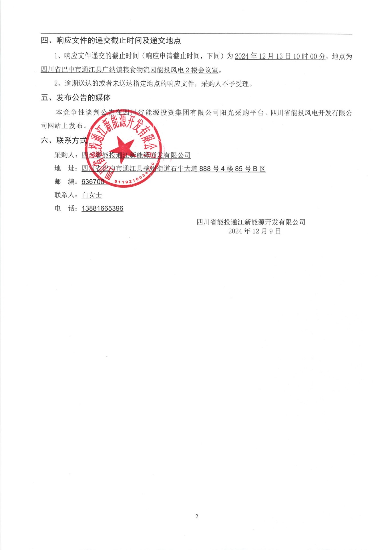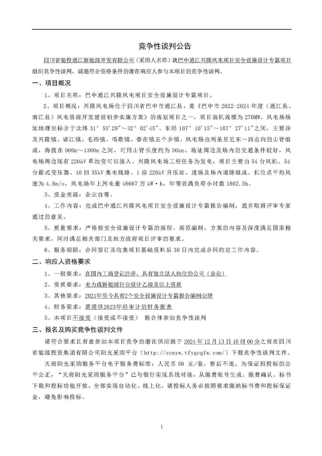四川省能投通江新能源开发有限公司(采购人名称)就巴中通江兴隆风电项目安全设施设计专篇项目组织竞争性谈判,诚邀符合资格条件的潜在响应人参与本项目的竞争性谈判。