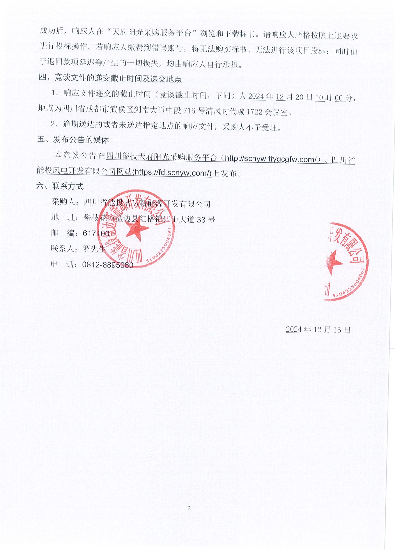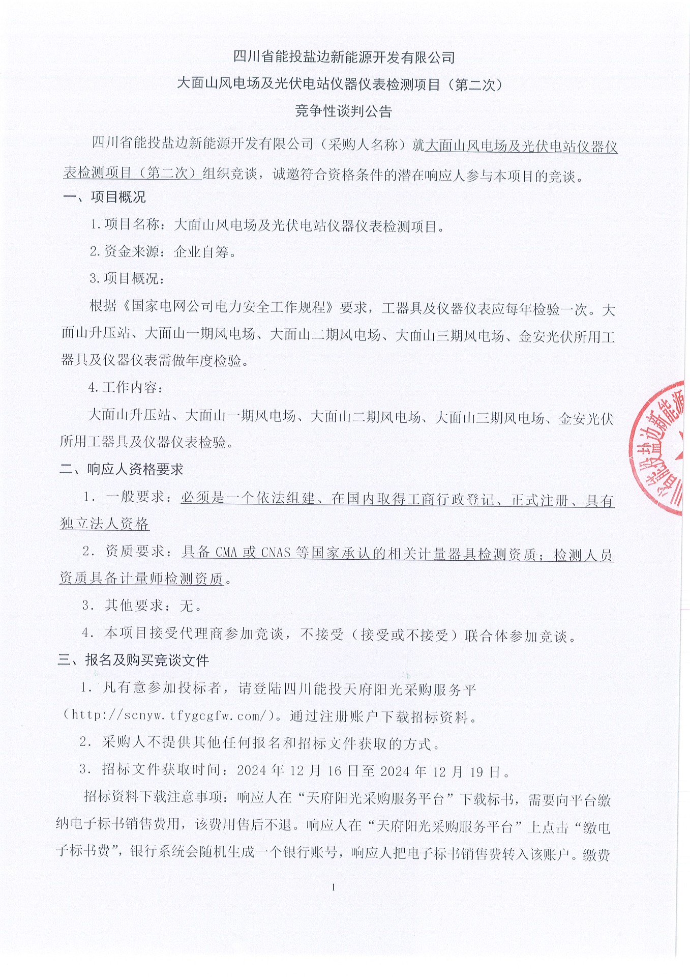 四川省能投盐边新能源开发有限公司(采购人名称)就大面山风电场及光伏电站仪器仪表检测项目(第二次)组织竞谈,诚邀符合资格条件的潜在响应人参与本项目的竞谈。