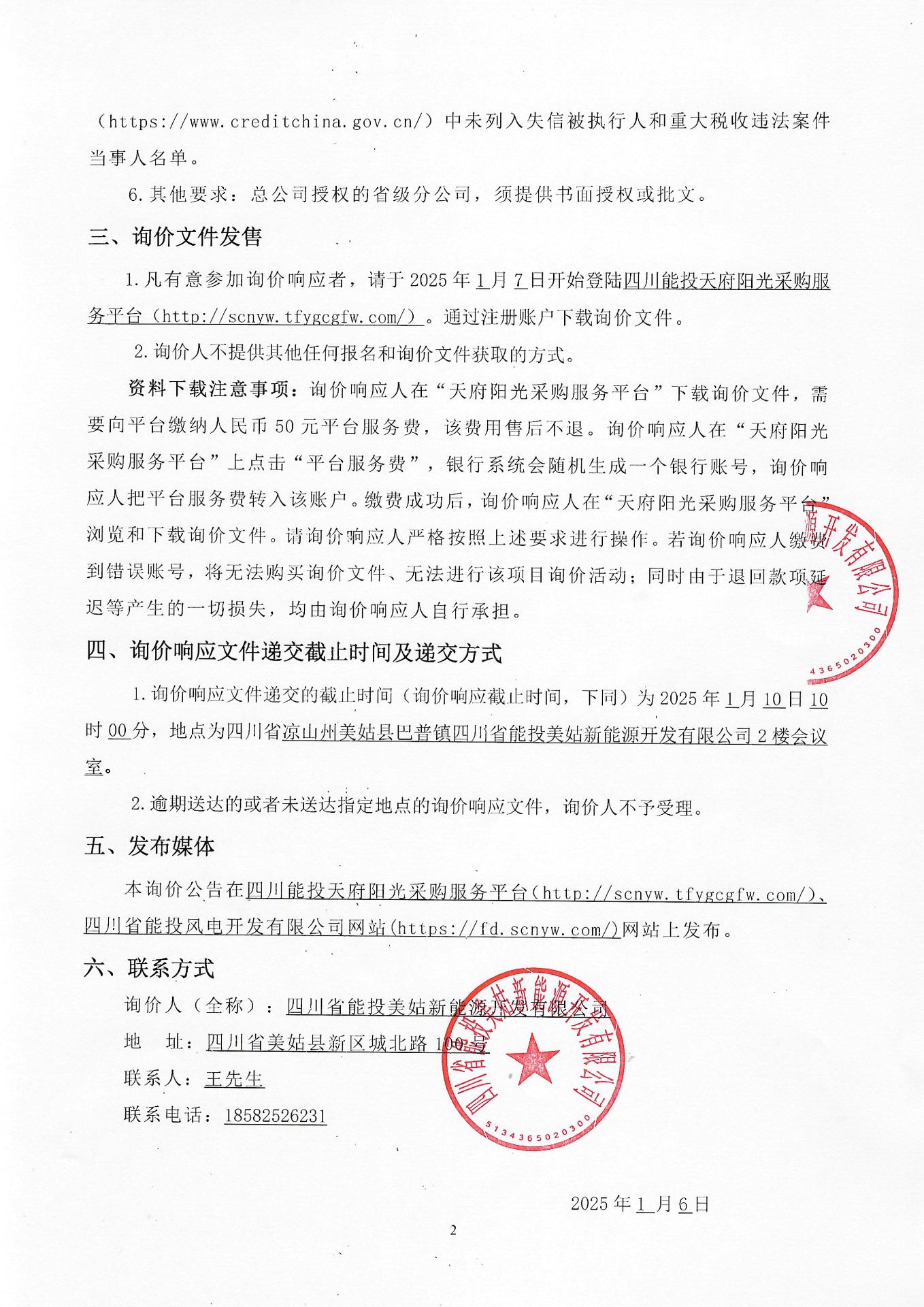 1.凡有意参加询价响应者,请于2025年1月7日开始登陆四川能投天府阳光采购服务平台(http://scnyw.tfygcgfw.com/)。通过注册账户下载询价文件。
