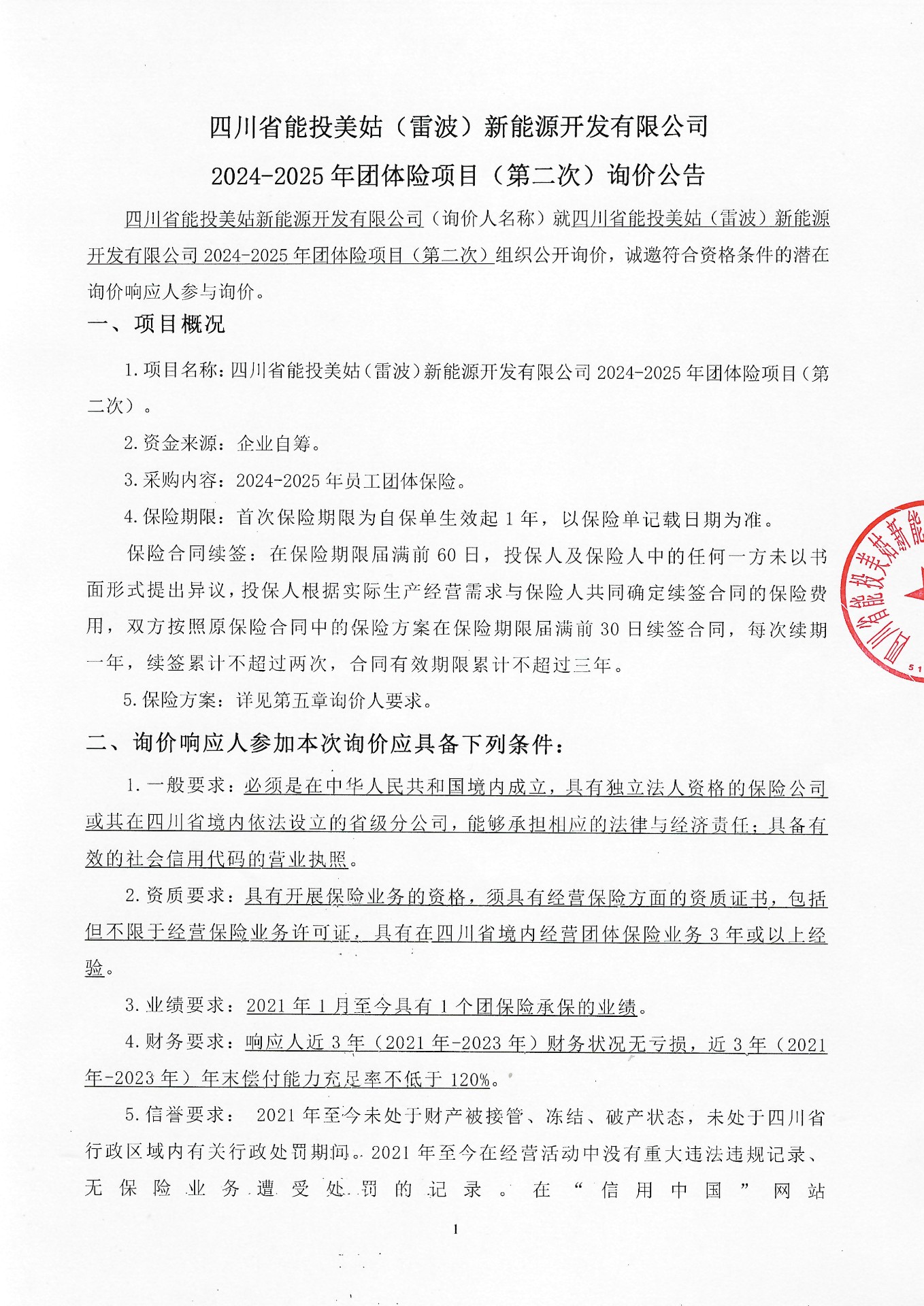 四川省能投美姑新能源开发有限公司(询价人名称)就四川省能投美姑(雷波)新能源开发有限公司2024-2025年团体险项目(第二次)组织公开询价,诚邀符合资格条件的潜在询价响应人参与询价。