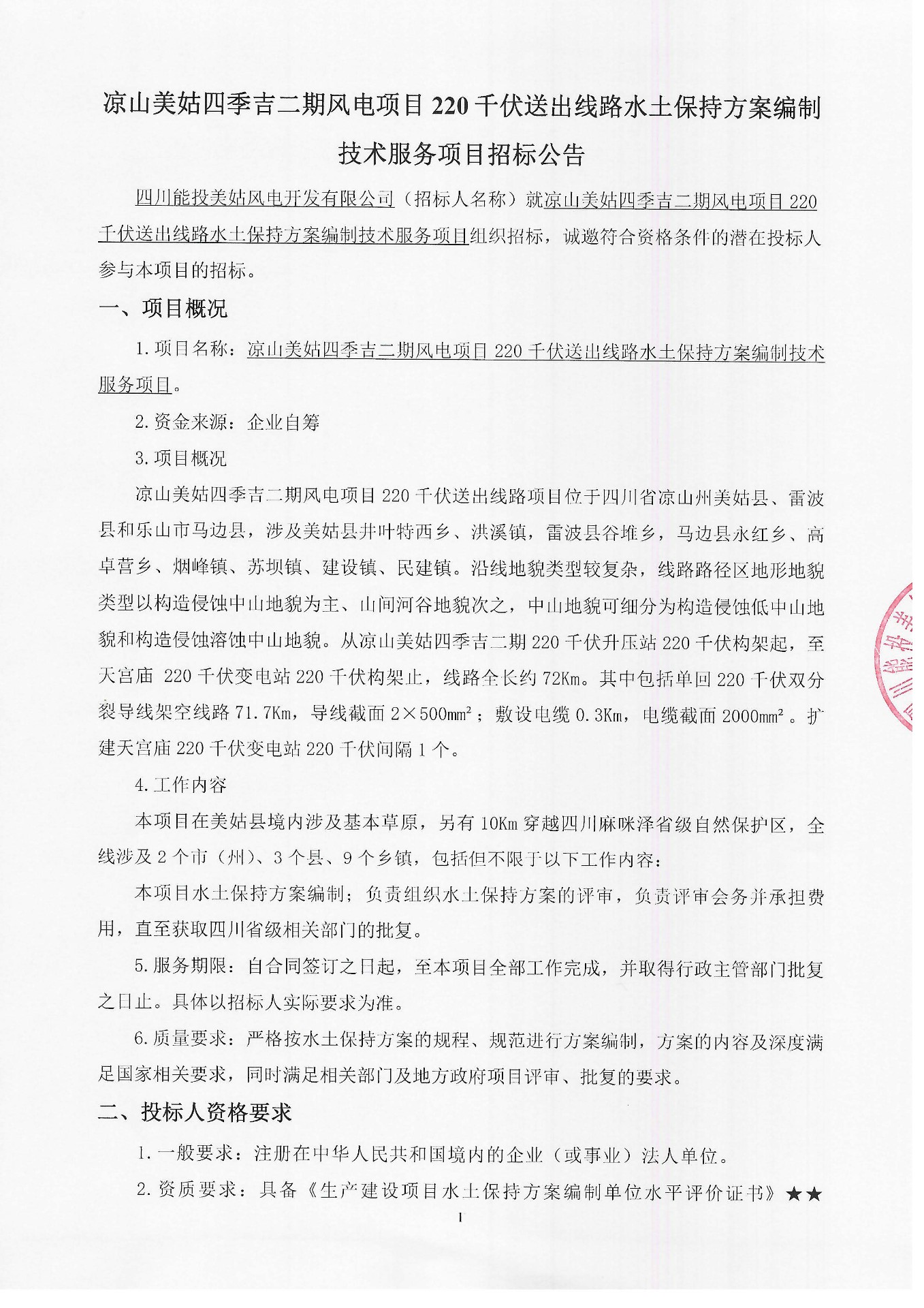 1.项目名称:凉山美姑四季吉二期风电项目220千伏送出线路水土保持方案编制技术服务项目。