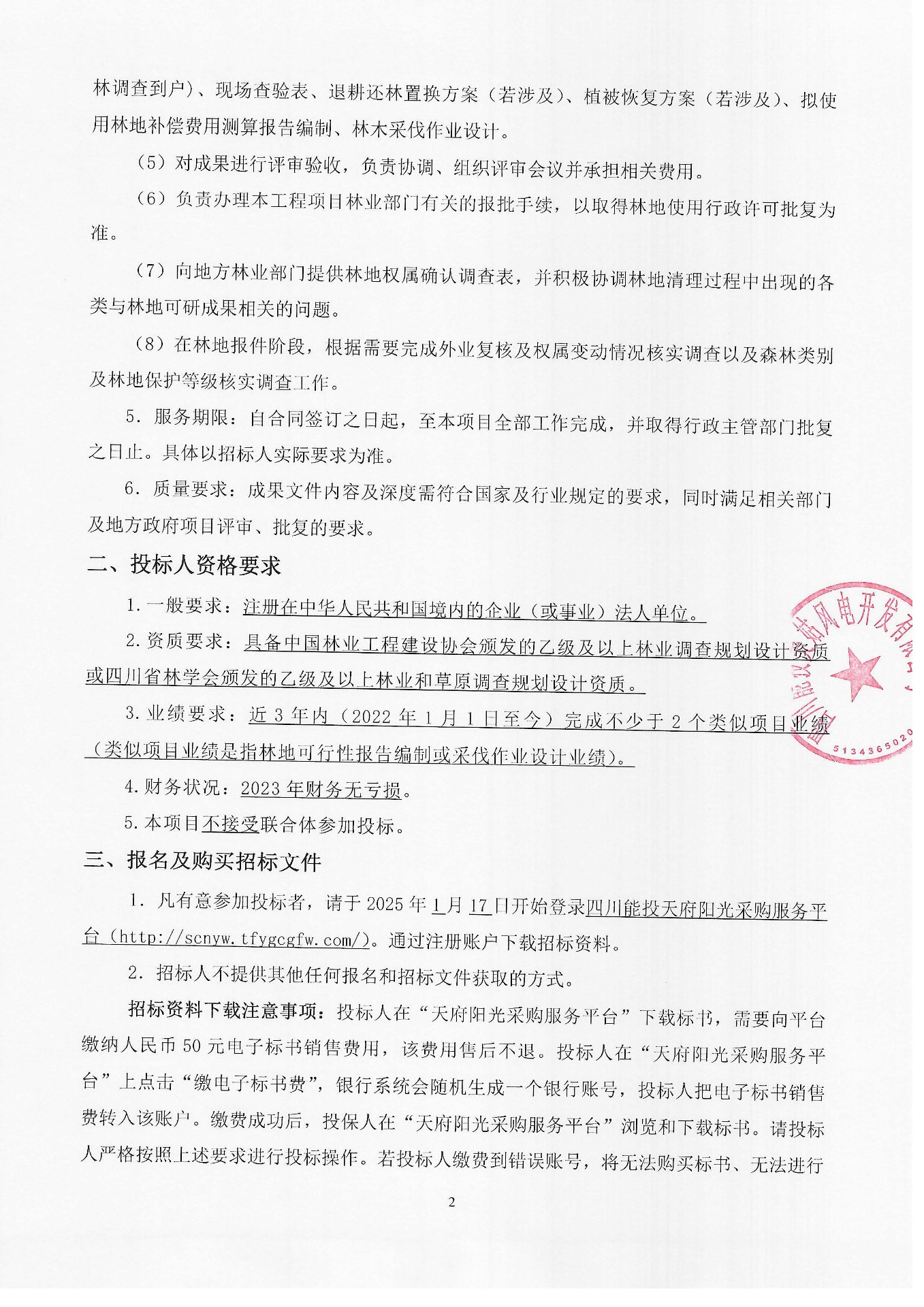 1.凡有意参加投标者,请于2025年1月17日开始登录四川能投天府阳光采购服务平台(http://scnyw.tfygcgfw.com/)。通过注册账户下载招标资料。
