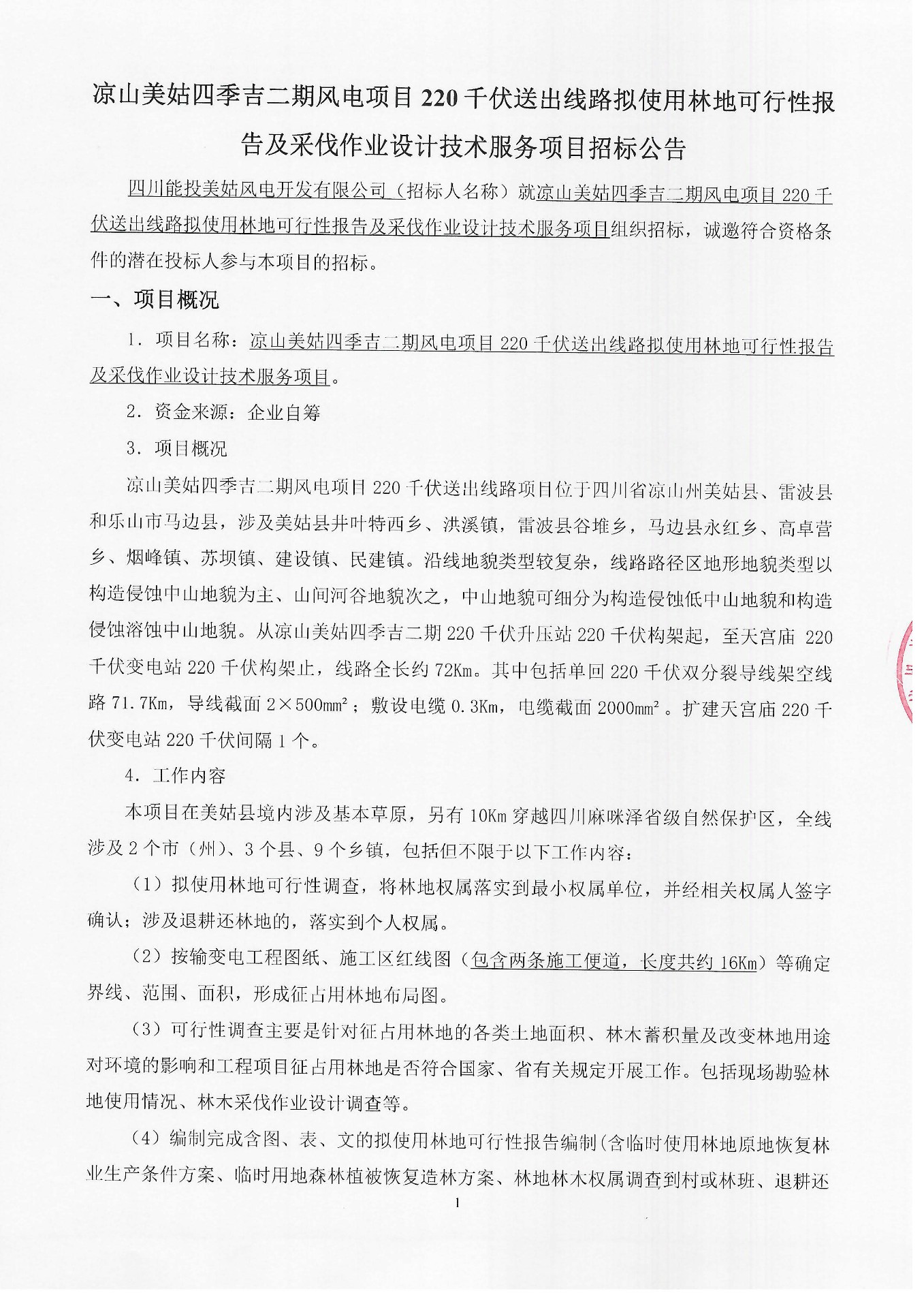 1.项目名称:凉山美姑四季吉二期风电项目220千伏送出线路拟使用林地可行性报告及采伐作业设计技术服务项目。