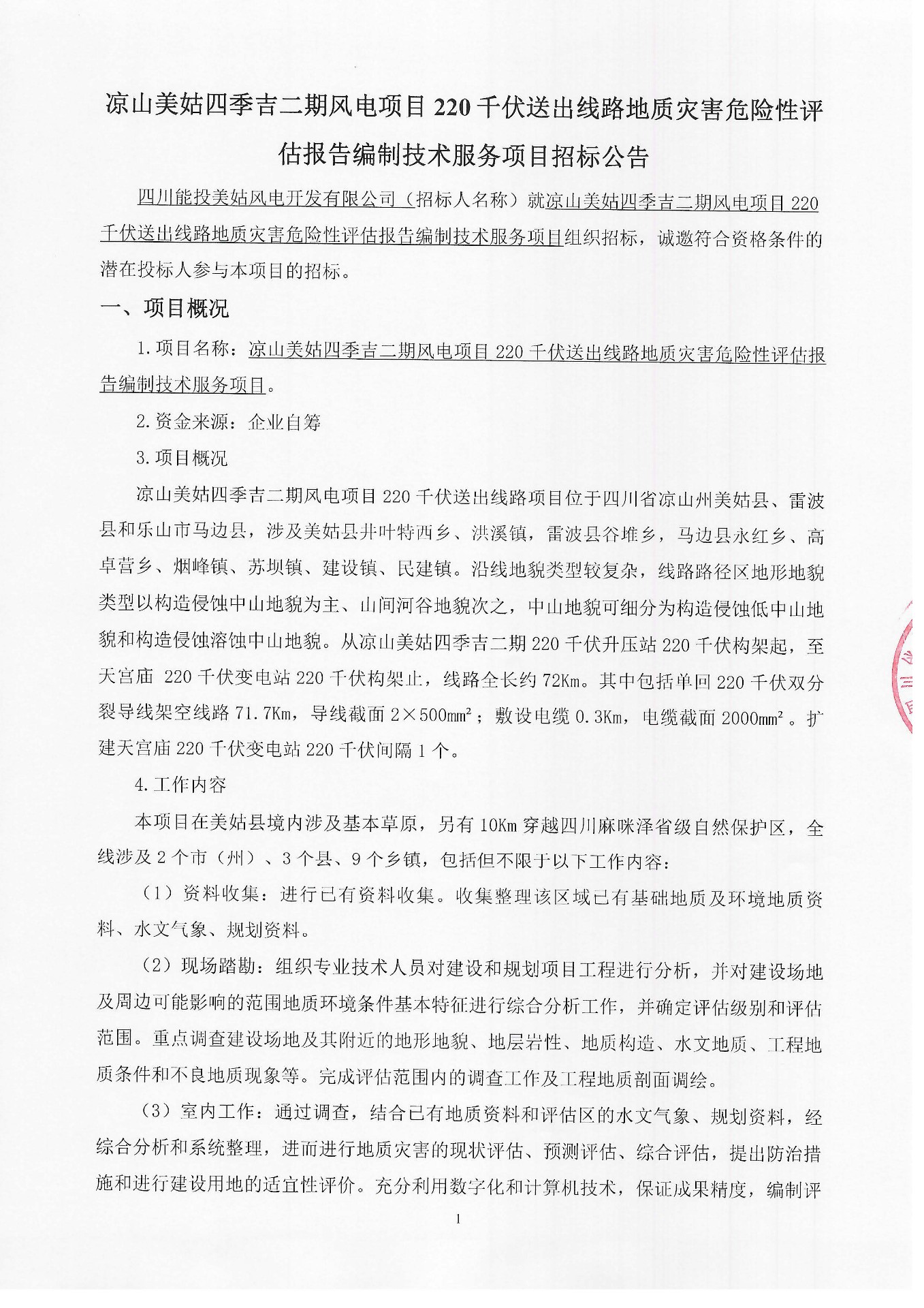 四川能投美姑风电开发有限公司(招标人名称)就凉山美姑四季吉二期风电项目220千伏送出线路地质灾害危险性评估报告编制技术服务项目组织招标,诚邀符合资格条件的潜在投标人参与本项目的招标。