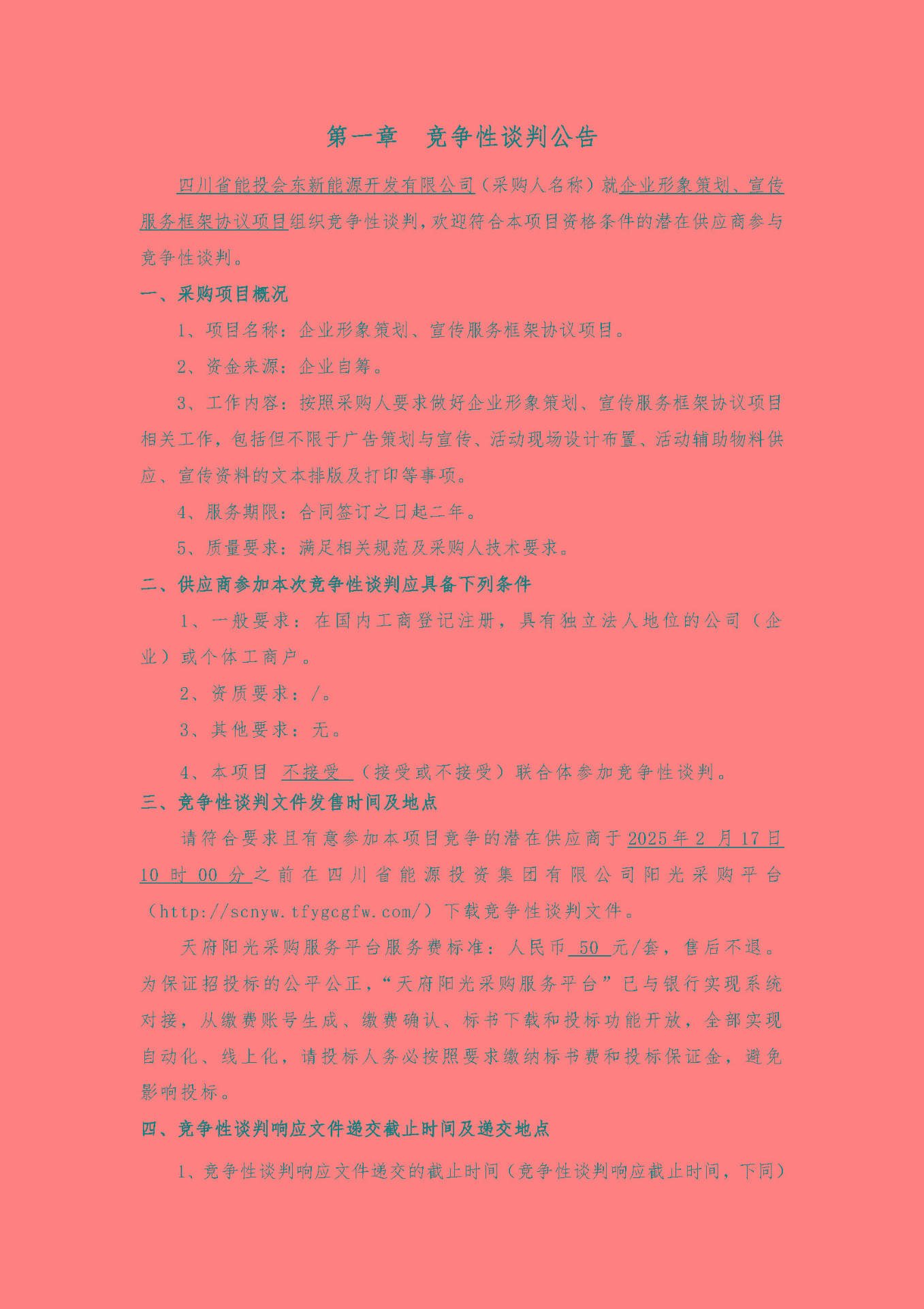 四川省能投会东新能源开发有限公司(采购人名称)就企业形象策划、宣传服务框架协议项目组织竞争性谈判,欢迎符合本项目资格条件的潜在供应商参与竞争性谈判。
